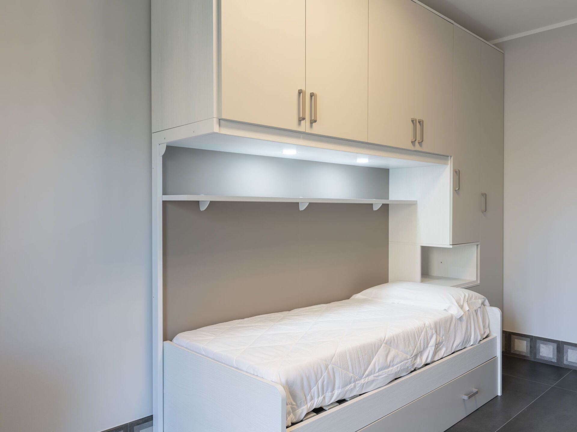 bij een vierpersoons appartement: 1 tweepersoons slaapkamer en 1 met een eenpersoonsbed en een uittrek bed en een bureau