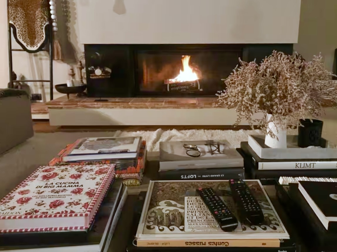 open plan living met zitgedeelte met open haard, sat TV, wifi en eettafel, toegang tot het terras aan achterzijde. Wifi en vloerkoeling/-verwarming.