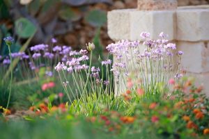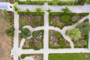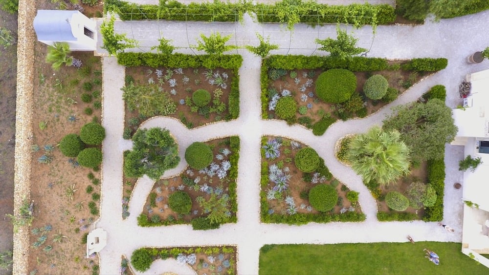 geheel omheinde tuin, formeel aangelegde kruidentuin annex fruitgaard annex citrusgaard, bosdeel met hangmatten, bordes met uitzicht op de landerijen.