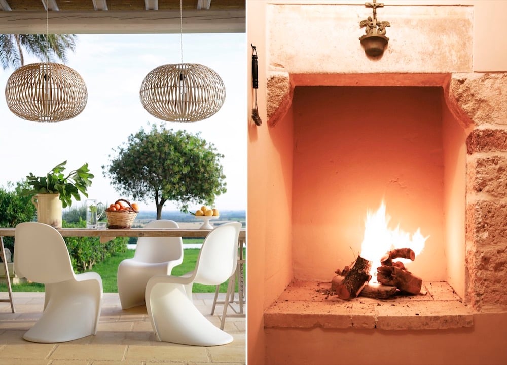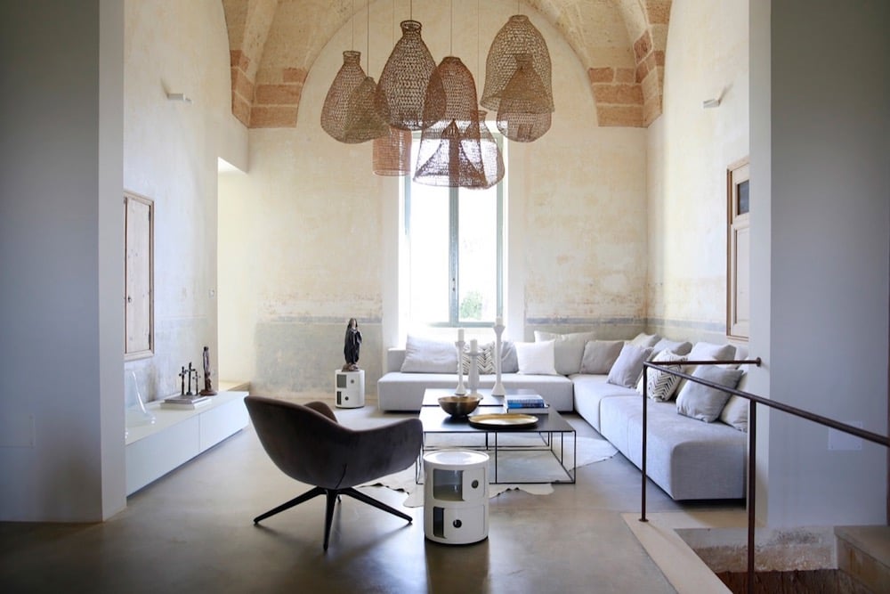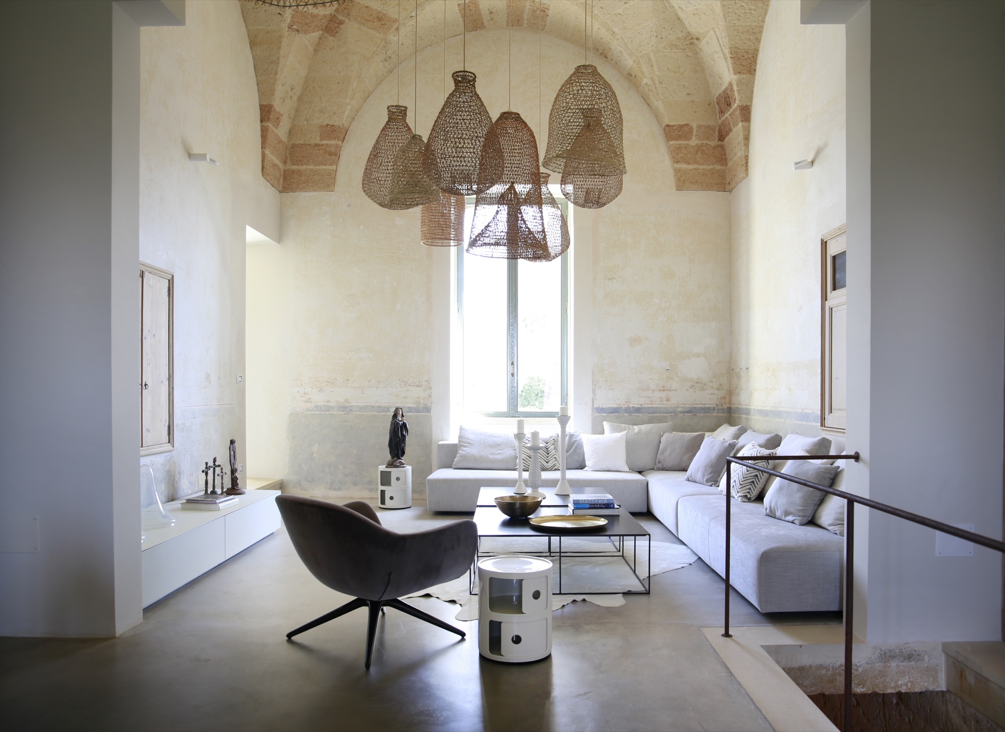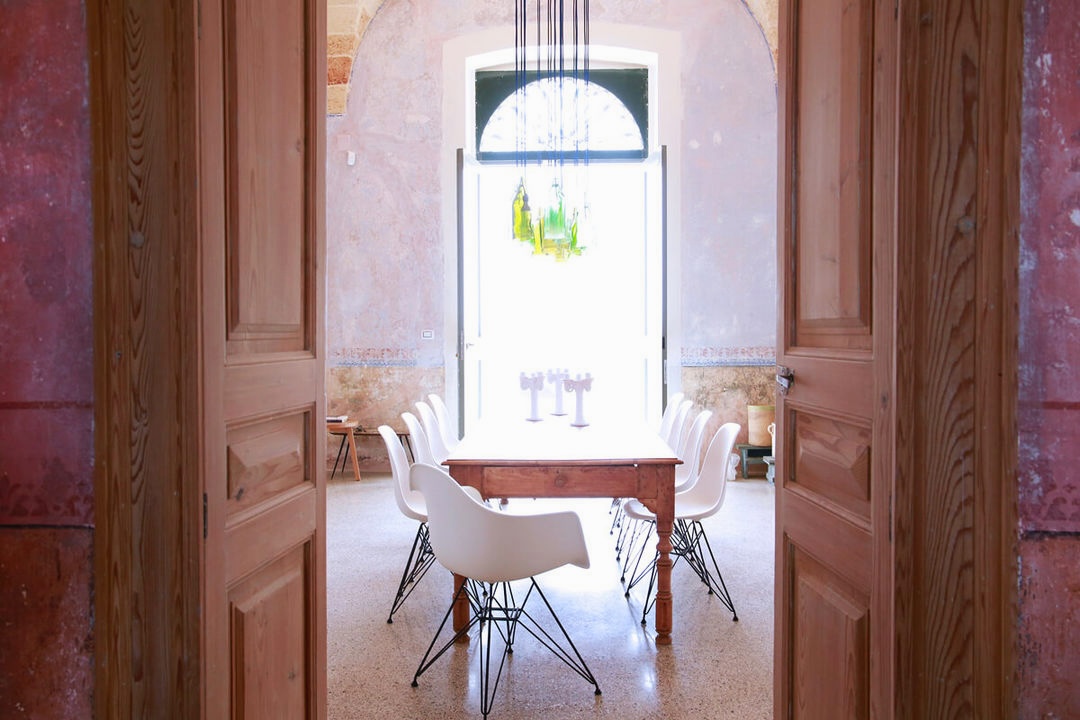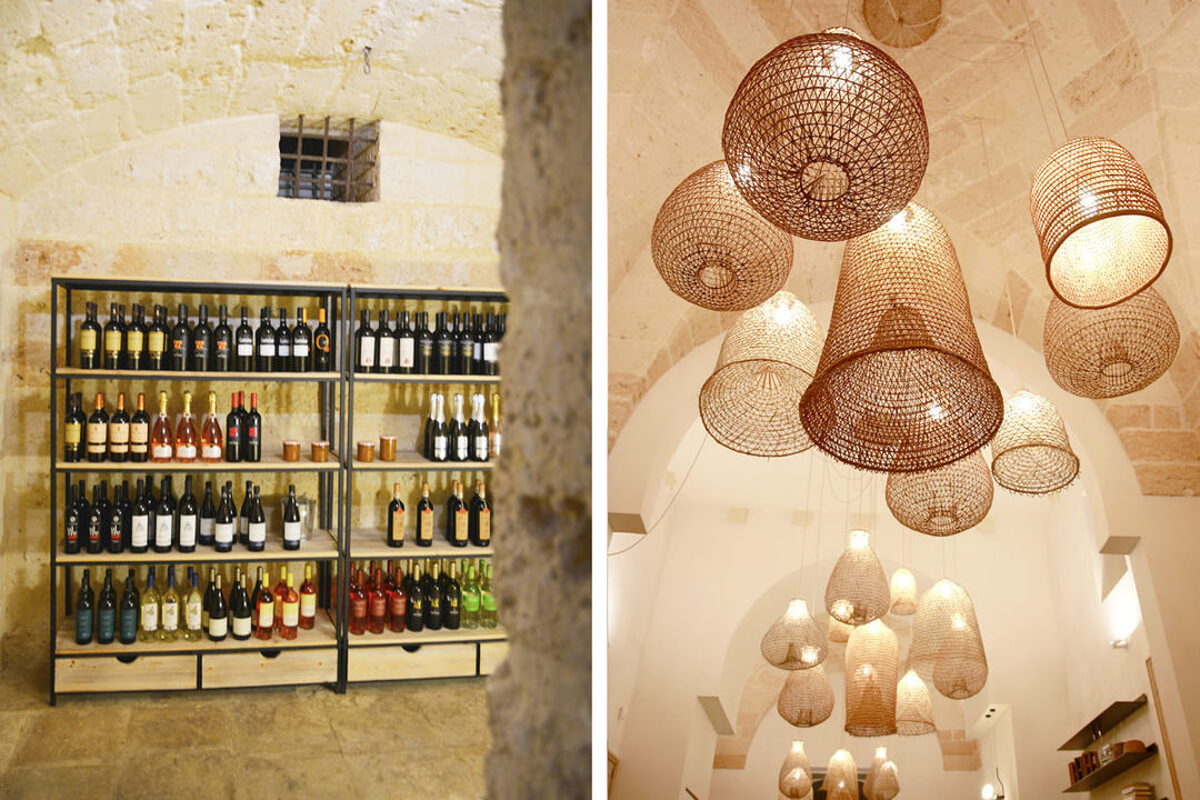 Binnenshuis vormt de woonkeuken met een strak belijnd rvs kookeiland het hart van het huis met direct toegang tot het terras buiten. De keuken is volledig uitgerust en zal zelfs de meest verwende kok een lach op het gezicht toveren. Op het buitenterras is een eettafel gezet met plaats voor 12 personen rond een rustieke tafel. Dit is waarschijnlijk de meest gebruikte plek om tezamen te geneieten ban een Pugliees maal, begeleidt door run van de wijnen uit de wijkelder. Hoewel ook de eetkamer binnen een sfeervolle plek is om gezamenlijk te dineren. Daarnaast is er binnen een droom van een living die zó in een interieur tijdschrift kan, een leeskamer voor wie zich rustig met een boek wil terugtrekken en een TV kamer. Achter de keuken ligt een hoge hal die door de eigenaars tot een romantische ruimte is omgetoverd en beneden aan een lange trap ligt de eigen wijnkelder met allerlei topwijnen uit de Salento. Met allerlei design stukken en fraaie lampen, gecombineerd met hedendaagse kunst is dit onmiskenbaar een modern huis. Maar door de gewelfde ruimtes, de verweerde muren en allerlei karakteristieke details te behouden, verloochent de masseria geenszins haar ware leeftijd.