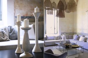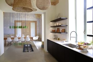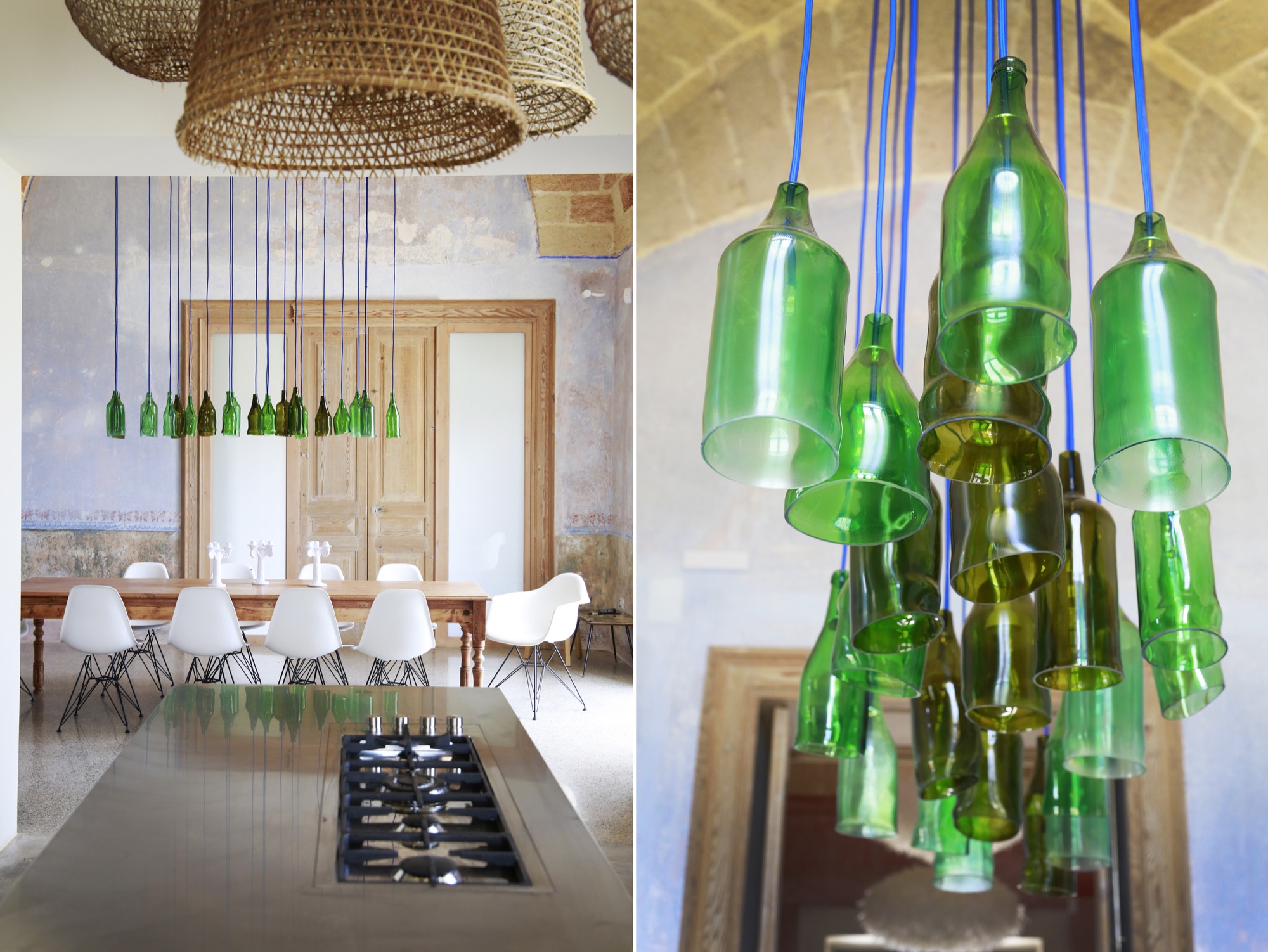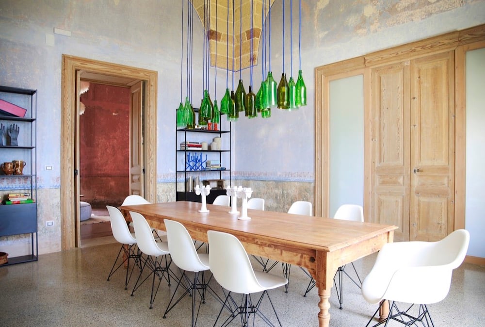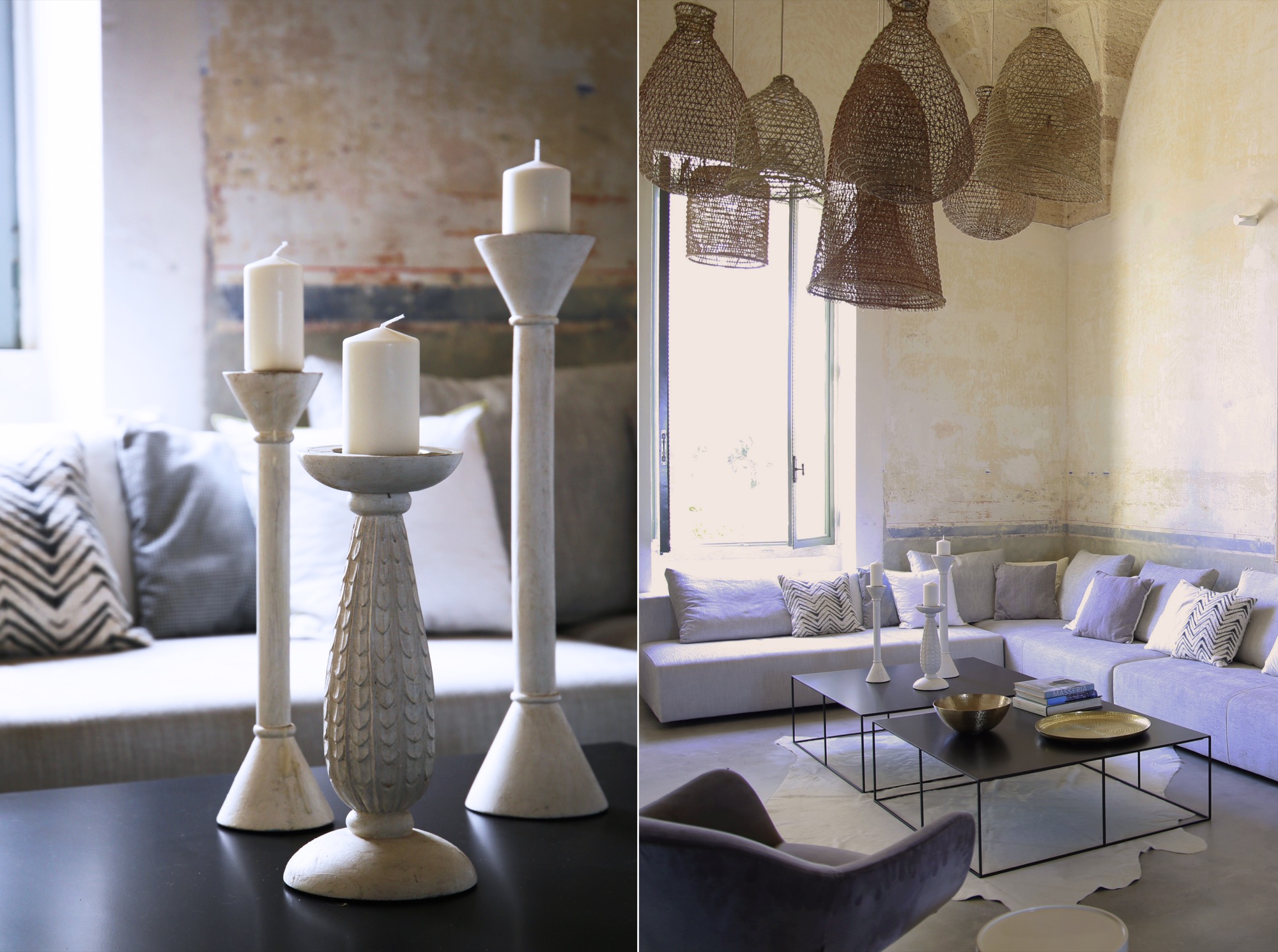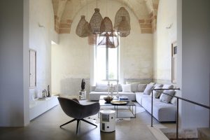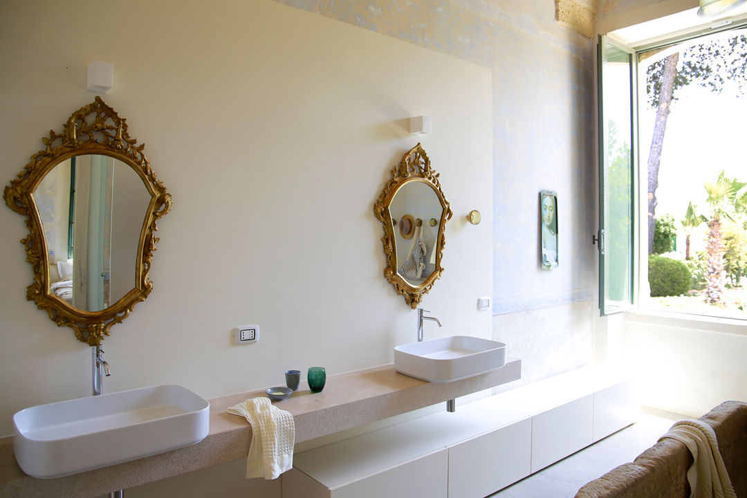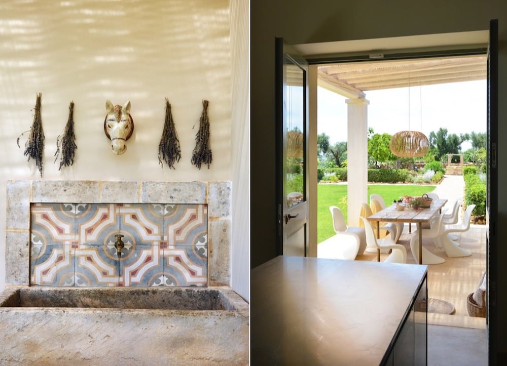 Binnenshuis vormt de woonkeuken met een strak belijnd rvs kookeiland het hart van het huis met direct toegang tot het terras buiten. De keuken is volledig uitgerust en zal zelfs de meest verwende kok een lach op het gezicht toveren. Op het buitenterras is een eettafel gezet met plaats voor 12 personen rond een rustieke tafel. Dit is waarschijnlijk de meest gebruikte plek om tezamen te geneieten ban een Pugliees maal, begeleidt door run van de wijnen uit de wijkelder. Hoewel ook de eetkamer binnen een sfeervolle plek is om gezamenlijk te dineren. Daarnaast is er binnen een droom van een living die zó in een interieur tijdschrift kan, een leeskamer voor wie zich rustig met een boek wil terugtrekken en een TV kamer. Achter de keuken ligt een hoge hal die door de eigenaars tot een romantische ruimte is omgetoverd en beneden aan een lange trap ligt de eigen wijnkelder met allerlei topwijnen uit de Salento. Met allerlei design stukken en fraaie lampen, gecombineerd met hedendaagse kunst is dit onmiskenbaar een modern huis. Maar door de gewelfde ruimtes, de verweerde muren en allerlei karakteristieke details te behouden, verloochent de masseria geenszins haar ware leeftijd.