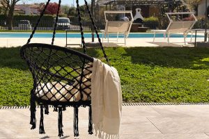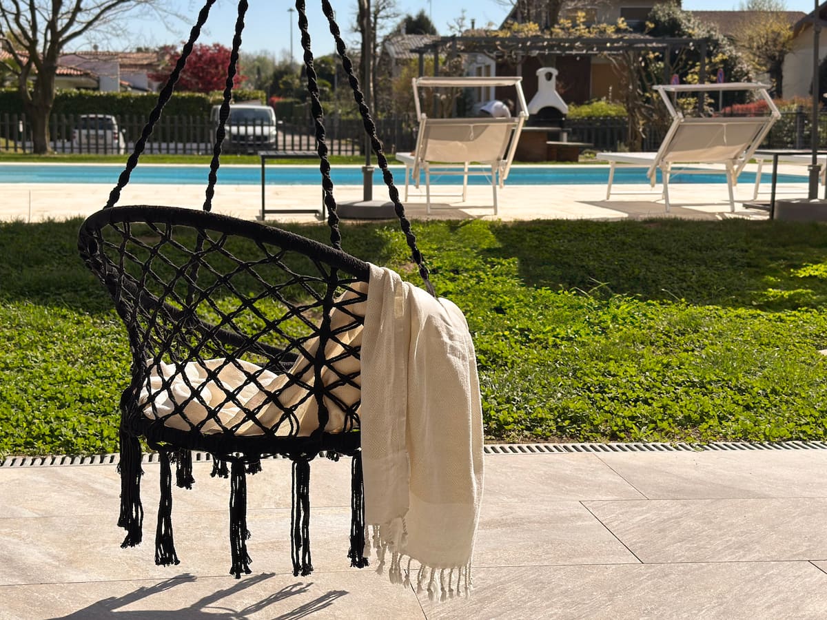 Gemeenschappelijk is de tuin waar een zwembad is aangelegd met daarom heen een zonneterras met de nodige ligbedden en parasols. Verder is er een overdekt terras met een paar zitjes, een hangmat en een BBQ plek waar een eettafel staat opgesteld.