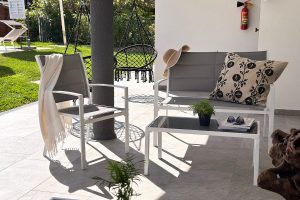 Een zithoek in de gemeenschappelijke tuin