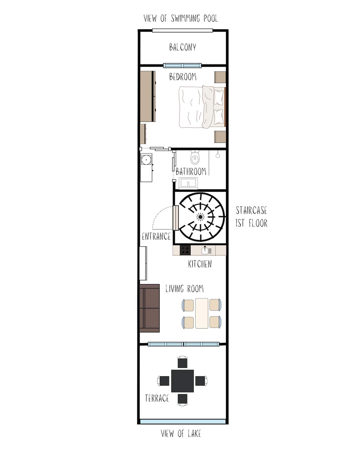 Met zowel op de eerste en tweede verdieping elk vijf appartementen, hebben alle accommodaties van Terralago een eigen terras aan meerzijde en een terras (eerste verdieping) of balkon (tweede verdieping) aan zwembadzijde. Aan meerzijde ligt tevens de living, een eigentijds ingerichte ruimte met een eettafel en zitbank die desgewenst ingezet kan worden als een extra tweepersoons bed. Via een hal is de andere zijde van het appartement bereikbaar waar een moderne badkamer met douche is gemaakt met aan het uiteinde een ruime slaapkamer met sat TV en een balkon of terras dat uitkijkt op het zwembad.