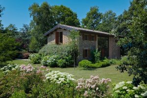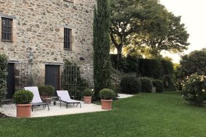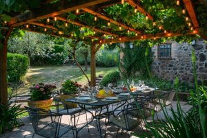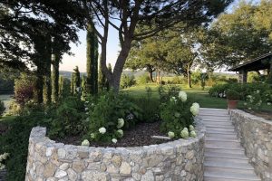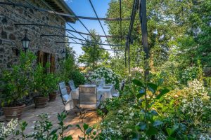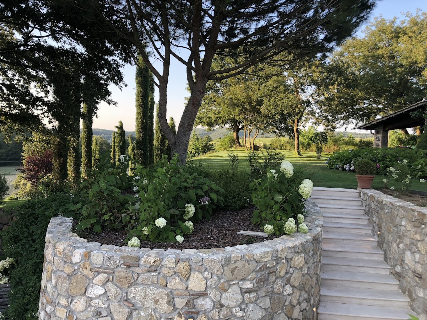 fraai aangelegde tuin rond de villa’s met overdekte terras aan beide villa’s, overal zitjes en een groot overdekt terras/poolhouse bij het zwembad. Parkeerplaatsen op eigen terrein.
