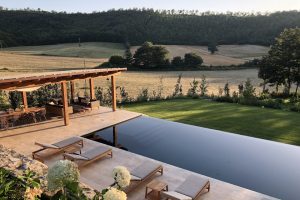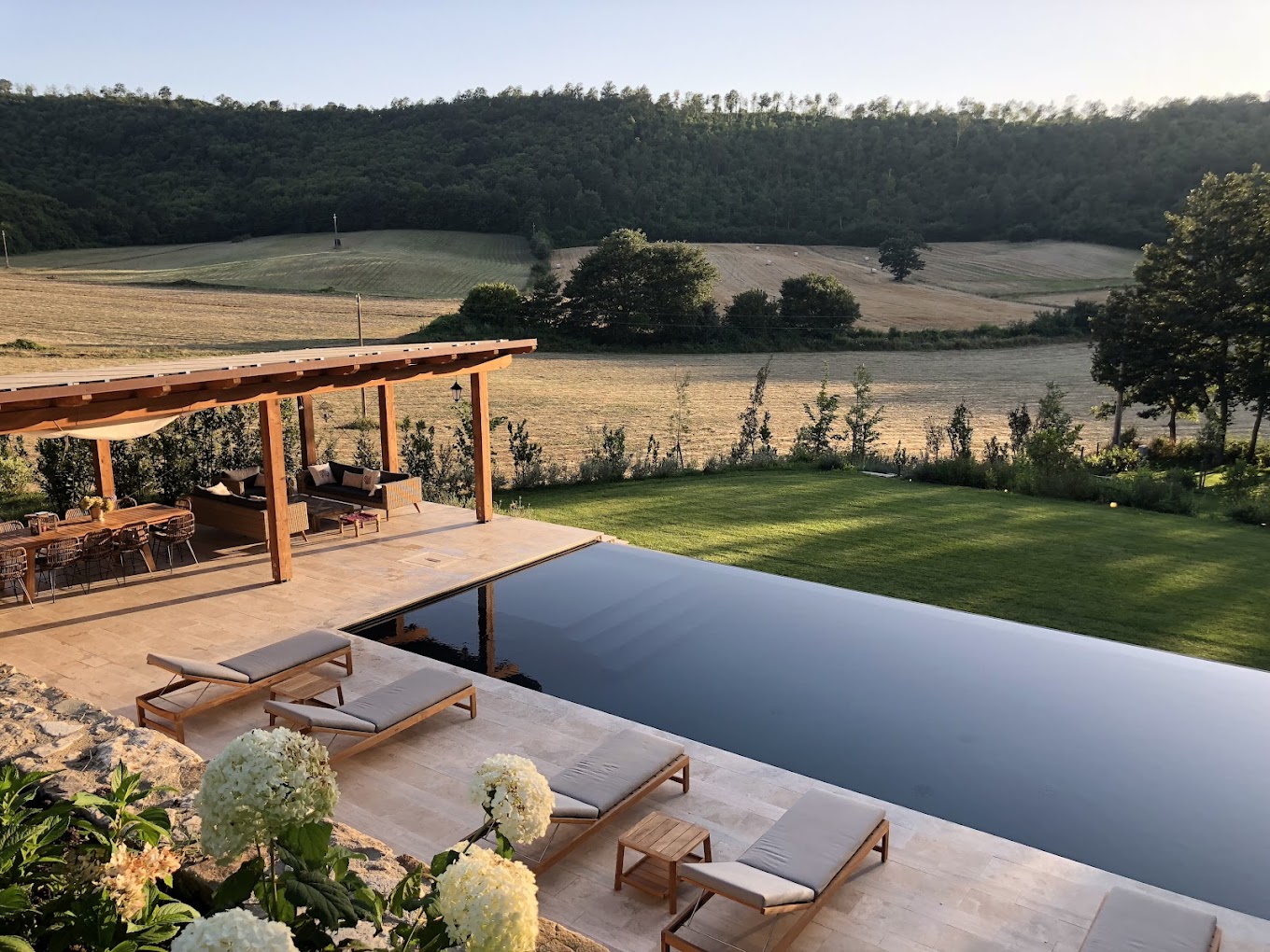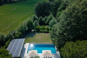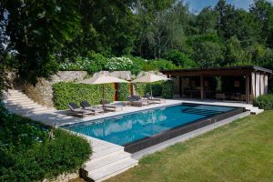 privé zwembad, 12 x.5 m, 1,5 m diep. zonneterras met ligbedden, poolhouse met loungehoek en eettafel, koelkastje en uittrek projectiescherm