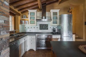 3 keukens, volledig uitgerust. Keuken in villa A met kookeiland.