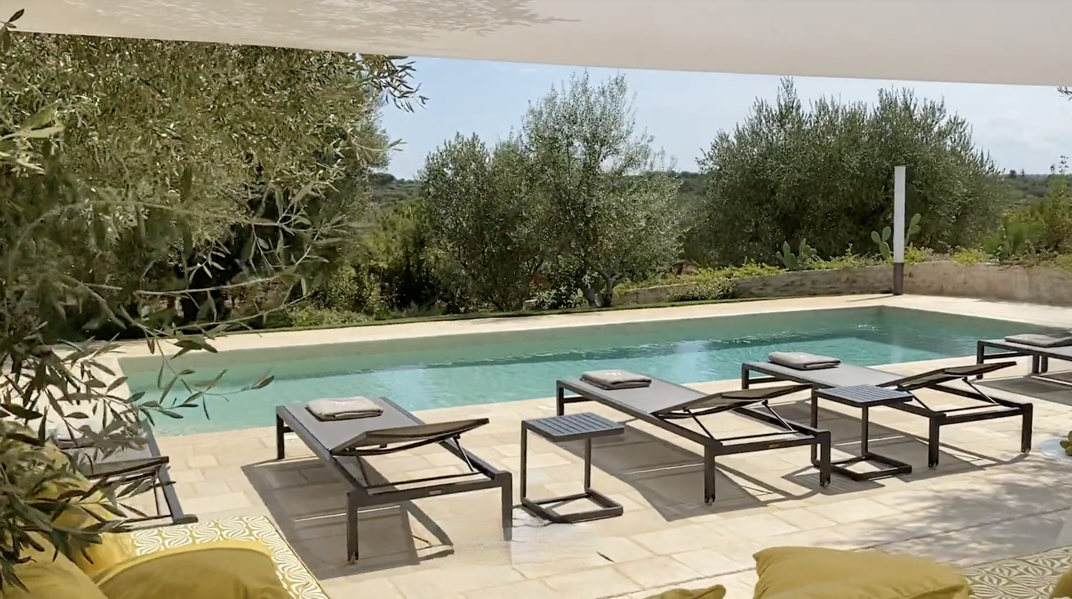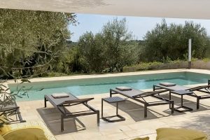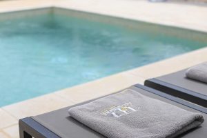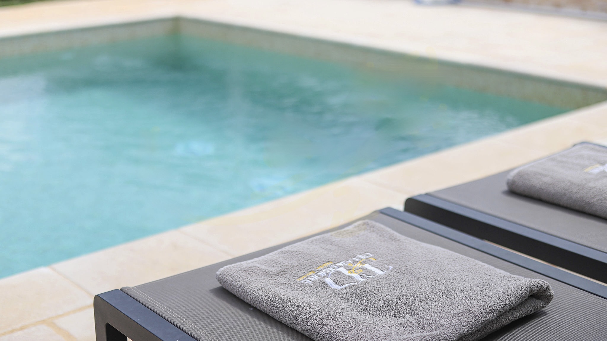privé zwembad, met zonneterras met ligbedden, muurbank en zonnezeil. Open van 1 april tot 31 oktober.
