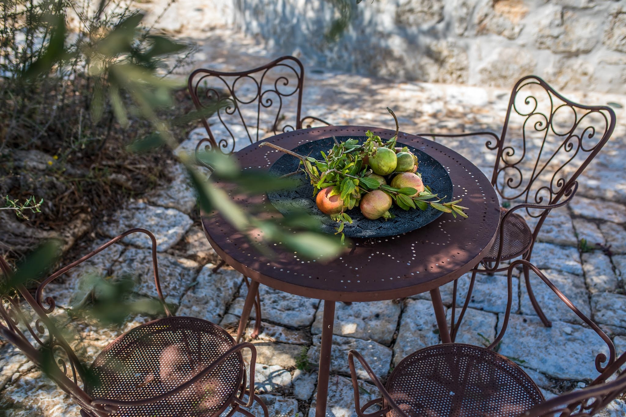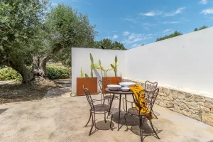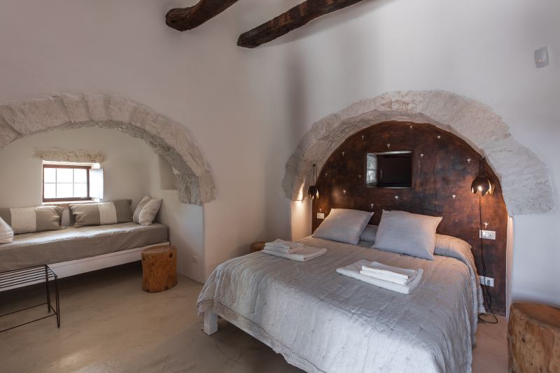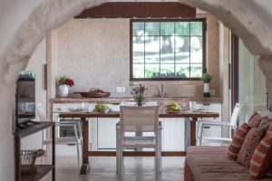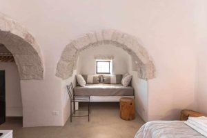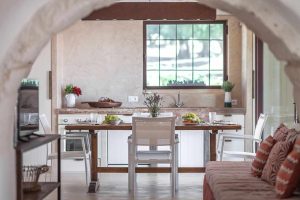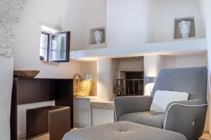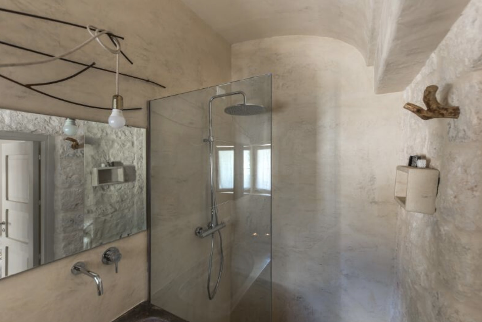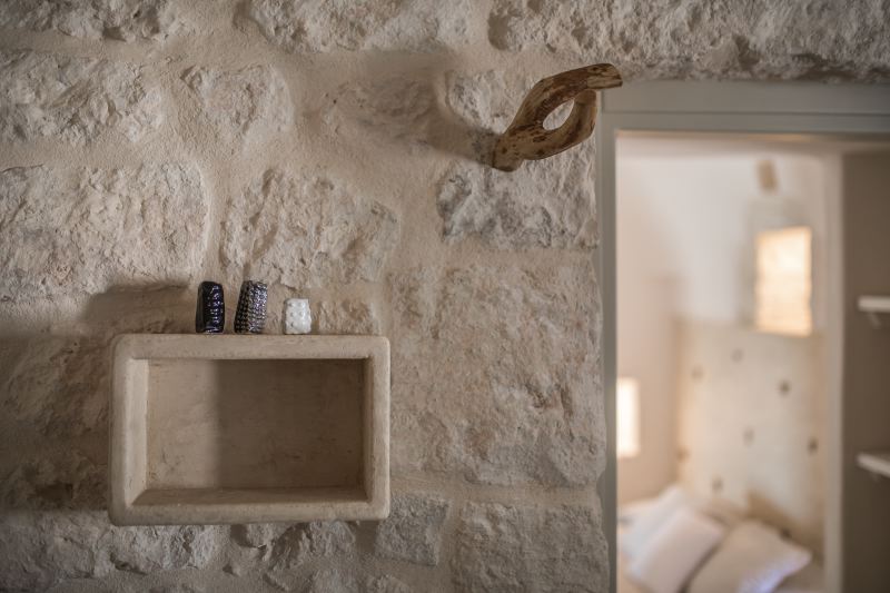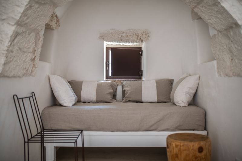 Naast de enorme ruimte rond de villa, is het interieur van Trullo Lou Lou minstens zo verrassend. De realxte living die uit de stoere keuken en eettafel bestaat en naast de ingang een muurbank vanwaar je de activiteiten in de keuken kan gadeslaan. Aan de ander kant is een knusse alkoof met een heerlijke relaxfauteuil neergezet, een fijne plek om op frissere dagen weg te kruipen. Naast deze geweldige leefruimtes die met airco zijn uitgerust, telt de Trullo-villa drie slaapkamers, waarvan twee in de trullo zelf. Elk met een fraaie badkamer waar eenvoud en functie elkaar ontmoeten. De derde slaap- en badkamer bevinden zich in de apart gelegen annex, eigenlijk een miniappartementje. Naast een tweepersoonsbed is er in een alkoof een extra eenpersoonsbed gemaakt, in de regel bestemd voor een kind. Plus een zithoekje voor een ontbijt.