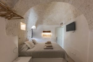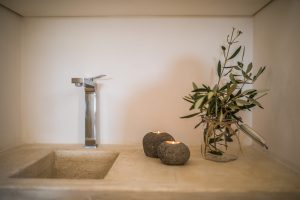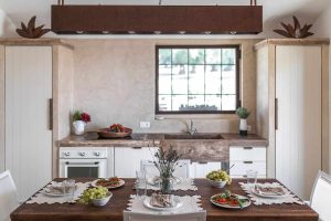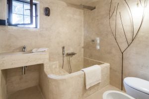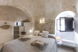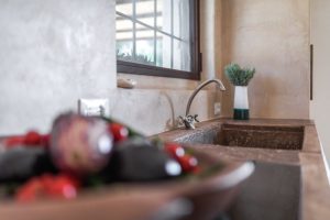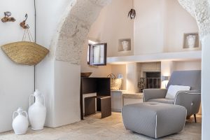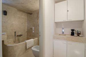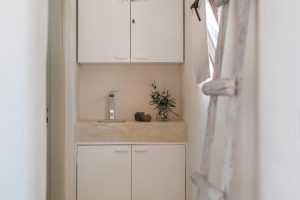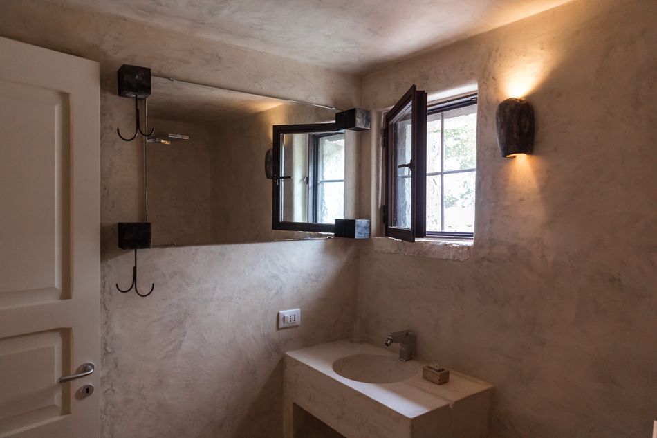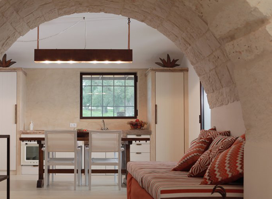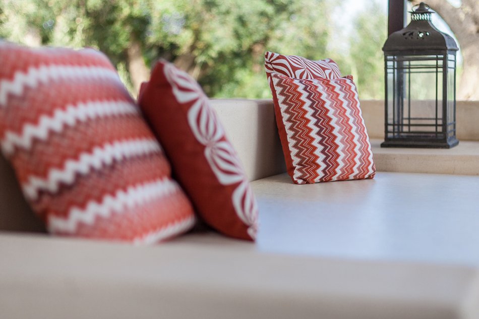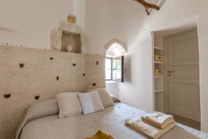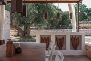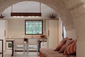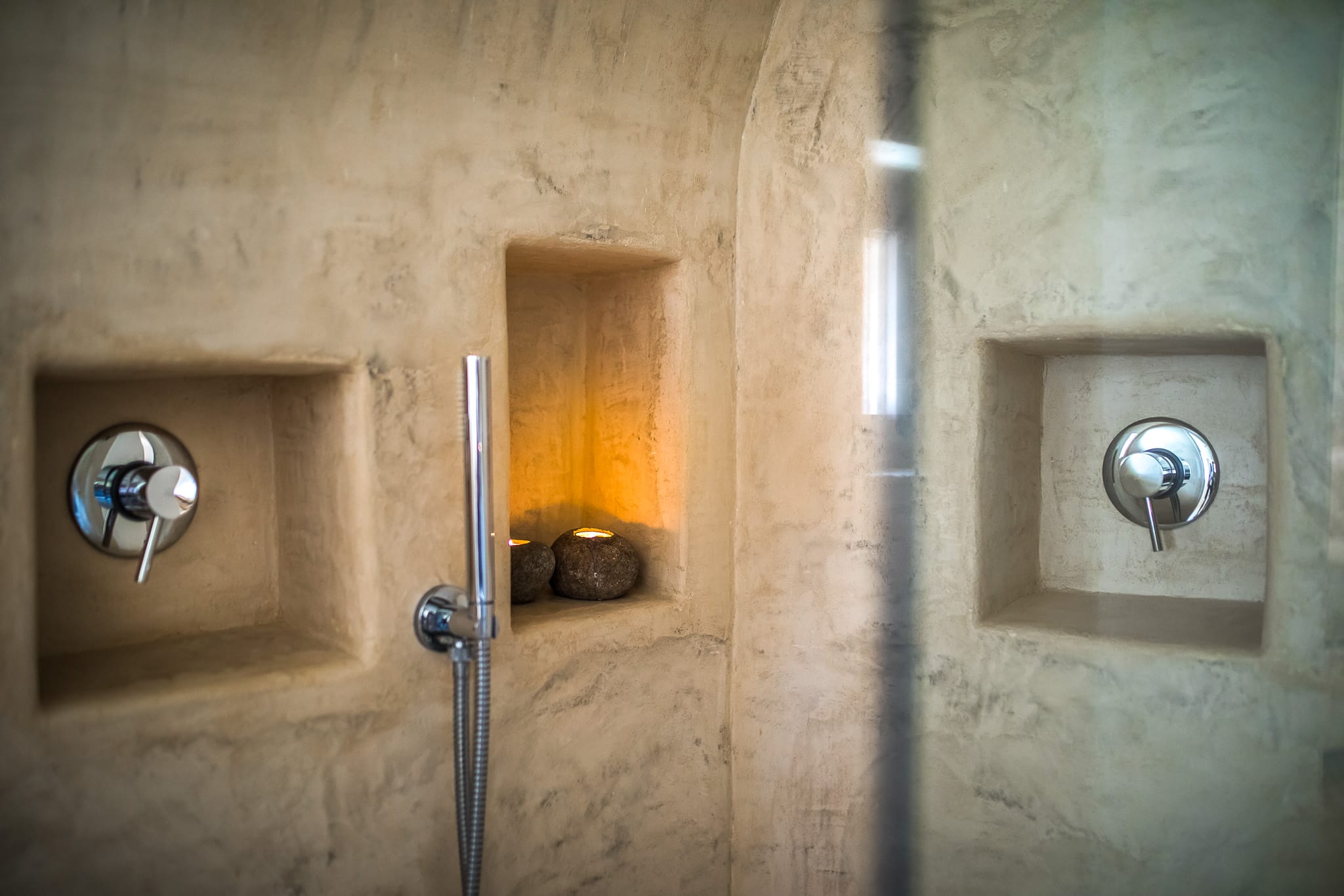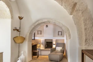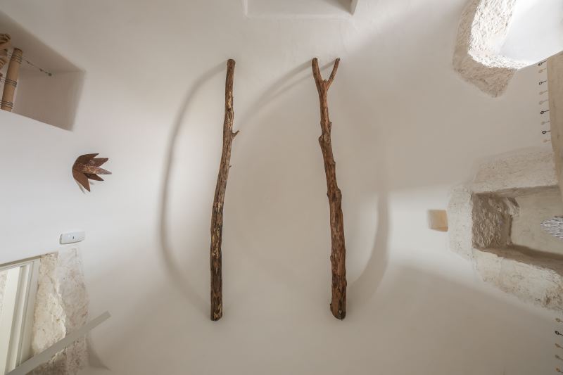 Naast de enorme ruimte rond de villa, is het interieur van Trullo Lou Lou minstens zo verrassend. De realxte living die uit de stoere keuken en eettafel bestaat en naast de ingang een muurbank vanwaar je de activiteiten in de keuken kan gadeslaan. Aan de ander kant is een knusse alkoof met een heerlijke relaxfauteuil neergezet, een fijne plek om op frissere dagen weg te kruipen. Naast deze geweldige leefruimtes die met airco zijn uitgerust, telt de Trullo-villa drie slaapkamers, waarvan twee in de trullo zelf. Elk met een fraaie badkamer waar eenvoud en functie elkaar ontmoeten. De derde slaap- en badkamer bevinden zich in de apart gelegen annex, eigenlijk een miniappartementje. Naast een tweepersoonsbed is er in een alkoof een extra eenpersoonsbed gemaakt, in de regel bestemd voor een kind. Plus een zithoekje voor een ontbijt.
