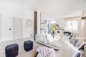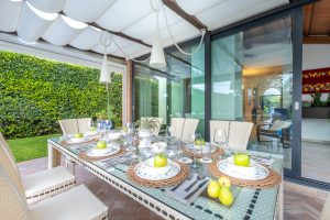 Achter in de tuin is een zithoek gecreëerd met zithoek en grote parasol. Hier is ook de annex gelegen, die een extra tweepersoons slaapkamer en eigen badkamer verschaft.