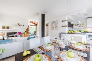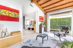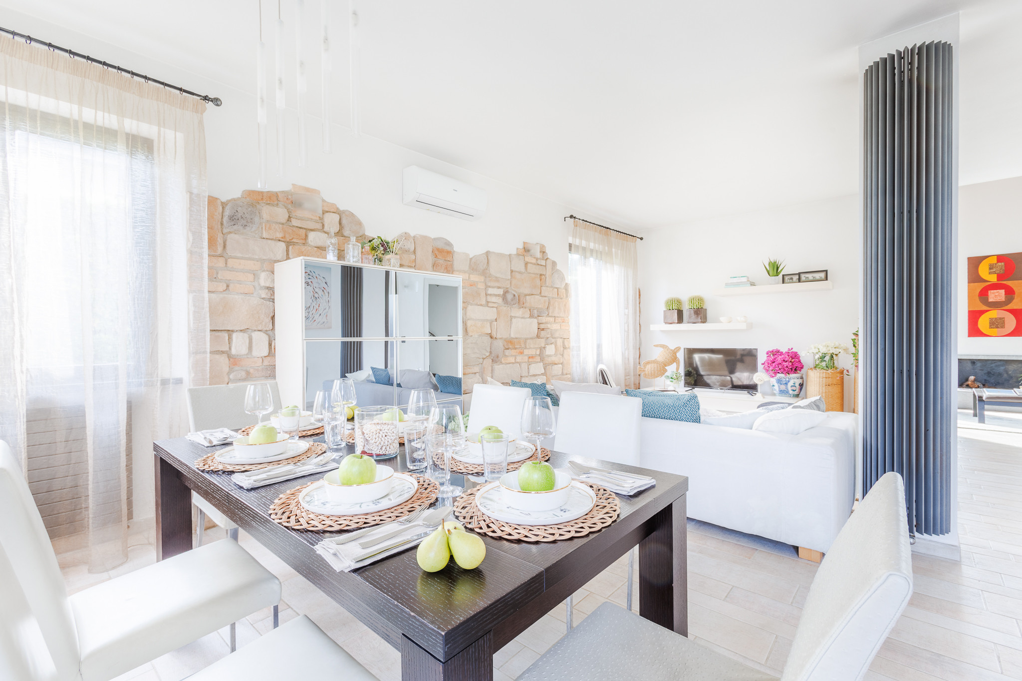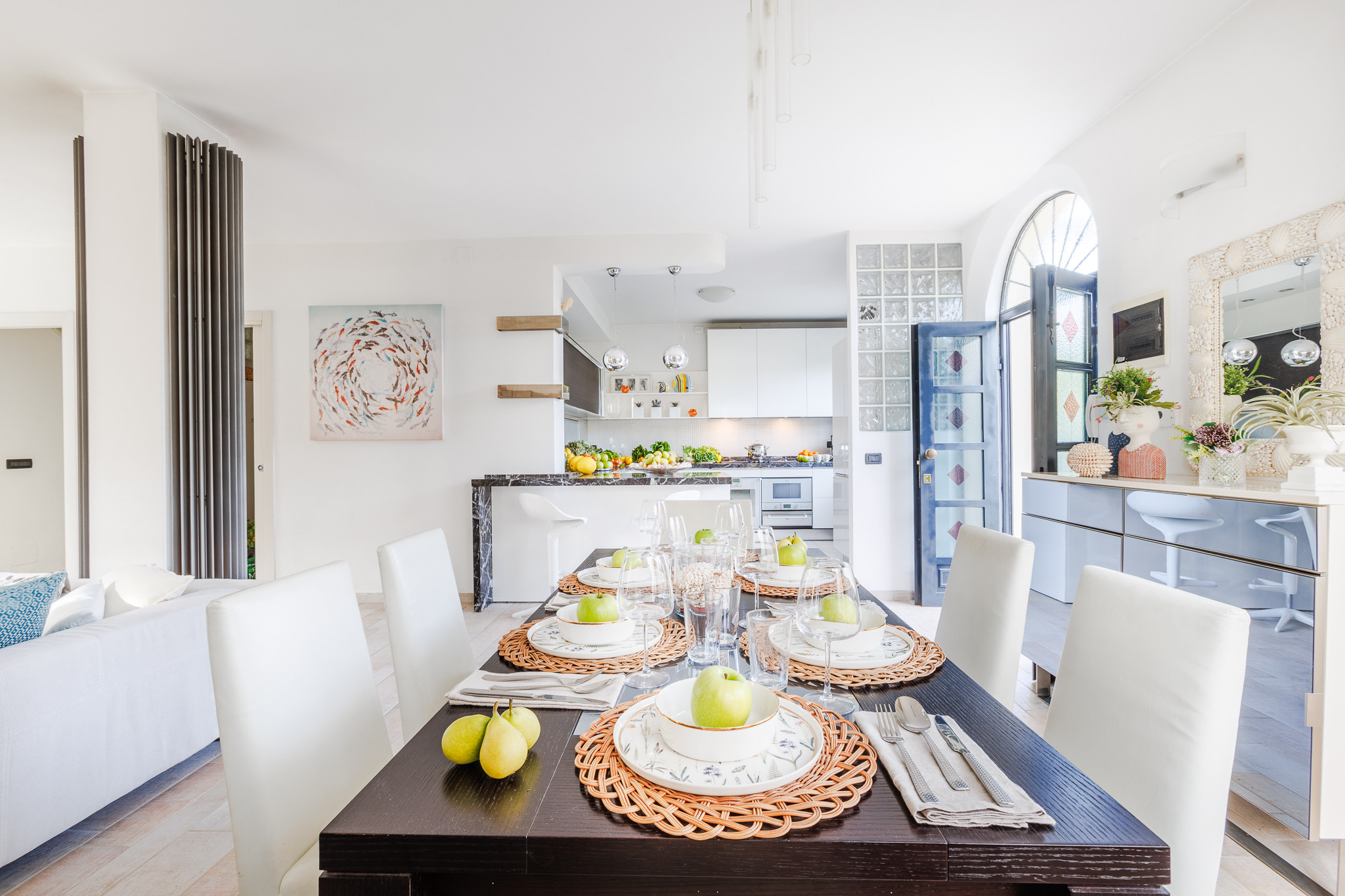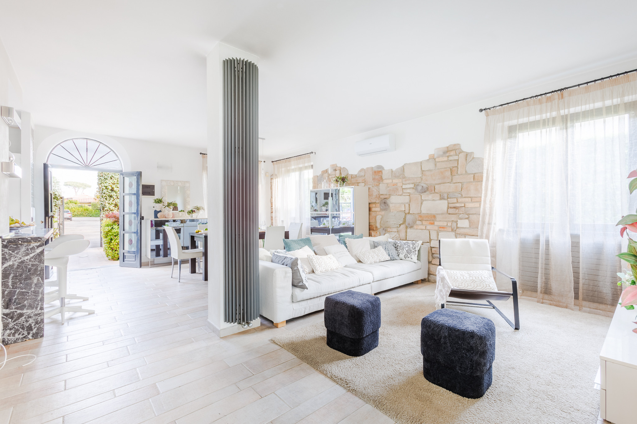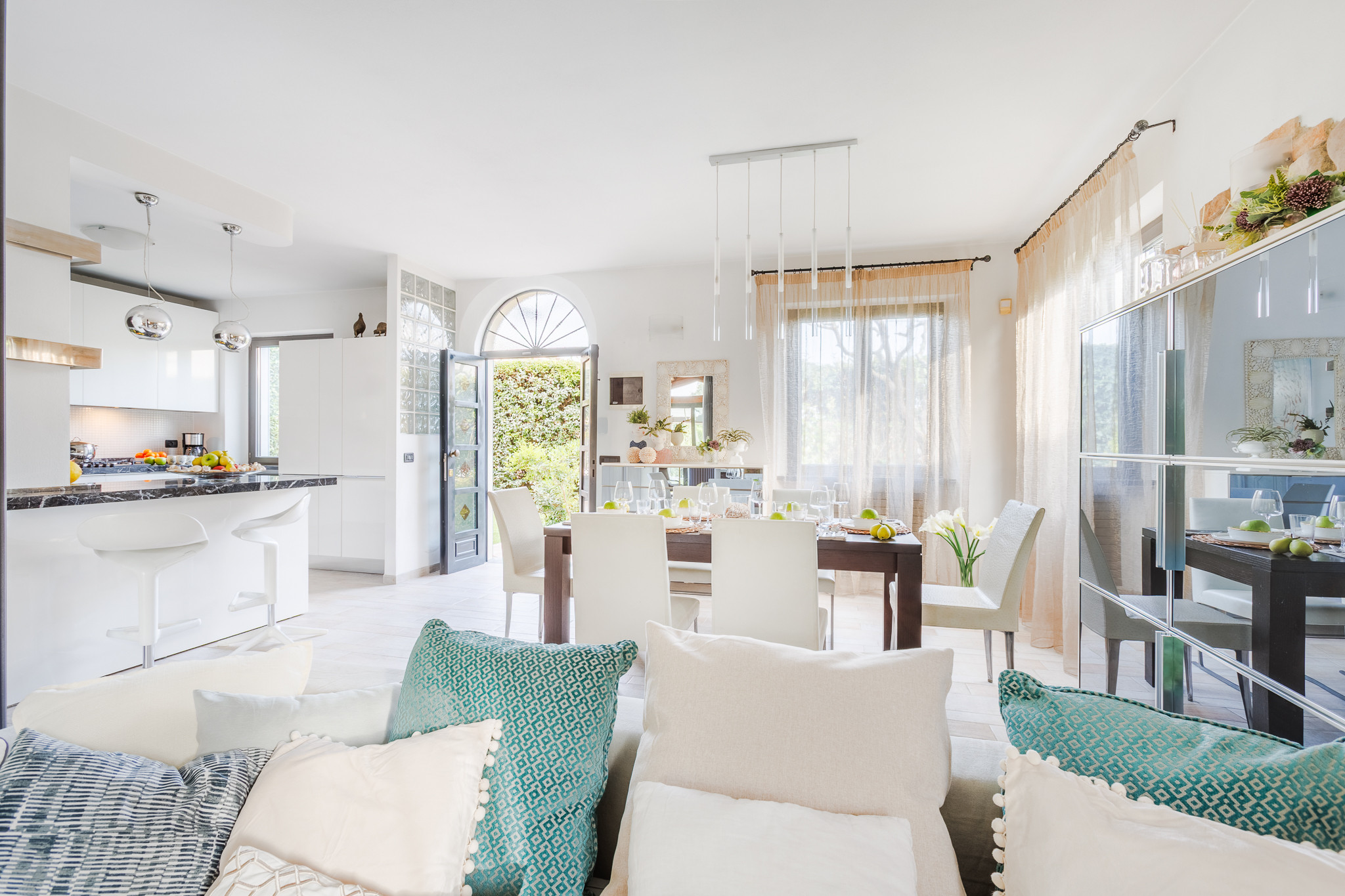 De begane grond van de witgestucte villa opent met een eigentijdse keuken in u-vorm met een groot, marmeren werkblad, voorzien van alle gemakken. Naast het keukengedeelte is de eettafel gepositioneerd met naar het midden van het open plan vertrek de comfortabele zithoek met sat. TV. Hierachter is een badkamer met bad gelegen en een mooie uitbouw die als een soort serre een extra zitruimte met twee luie stoelen verschaft en toegang geeft tot het overdekte terras met de eettafel buiten. Op de eerste verdieping van de villa liggen drie slaapkamers: een eenpersoons en twee tweepersoons slaapkamers die een badkamer delen.