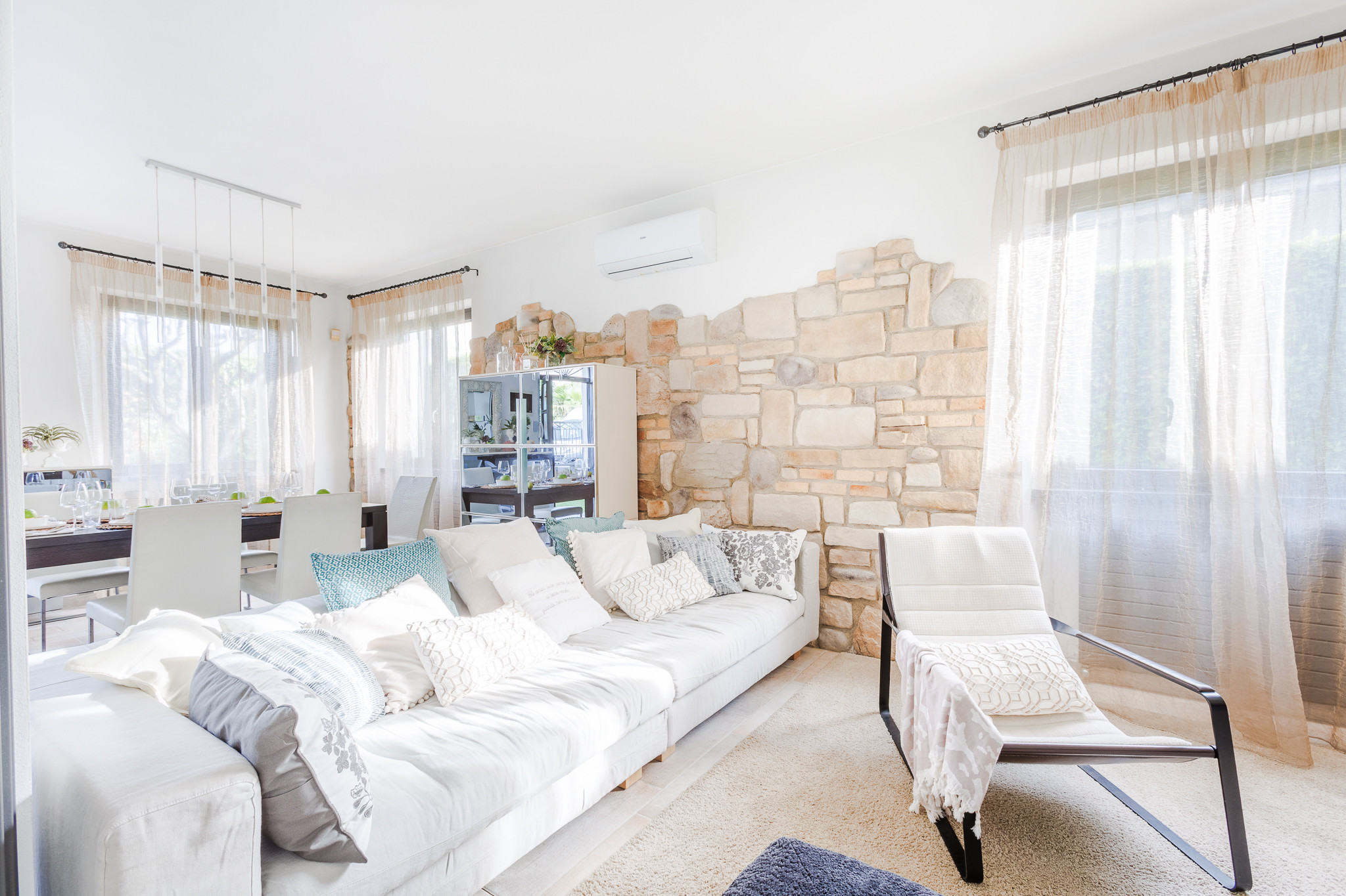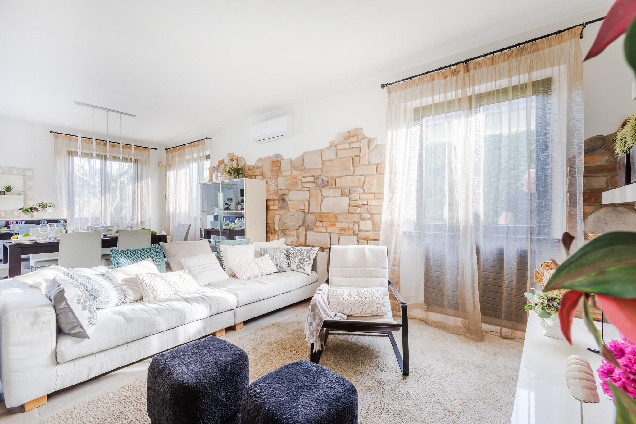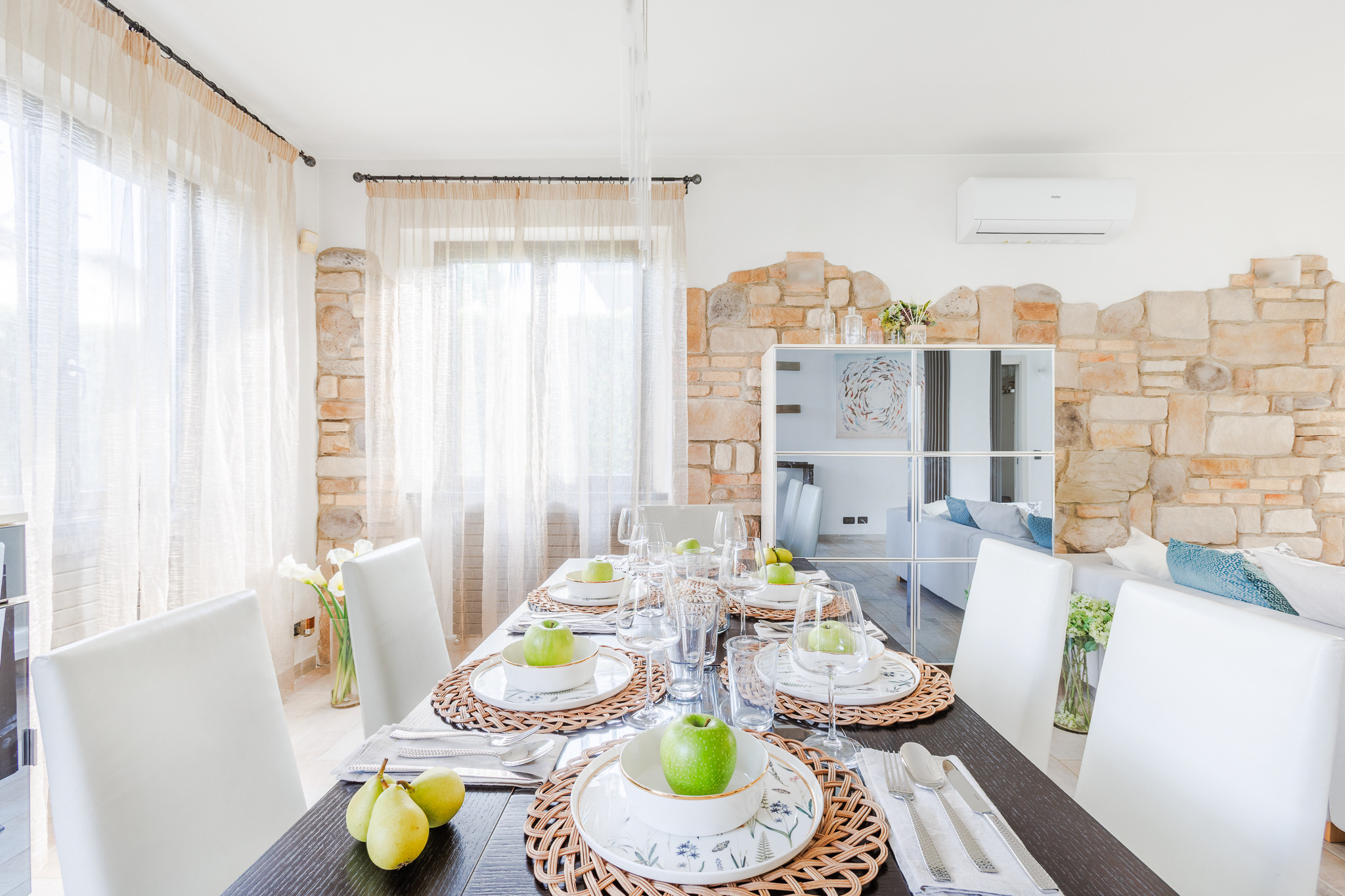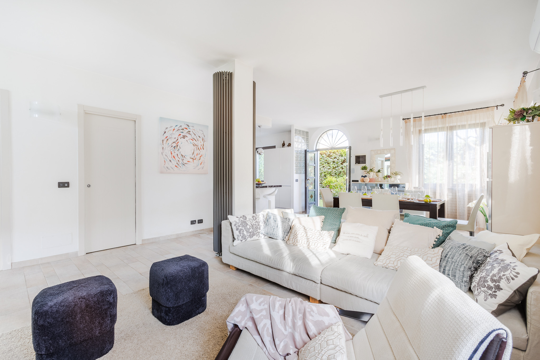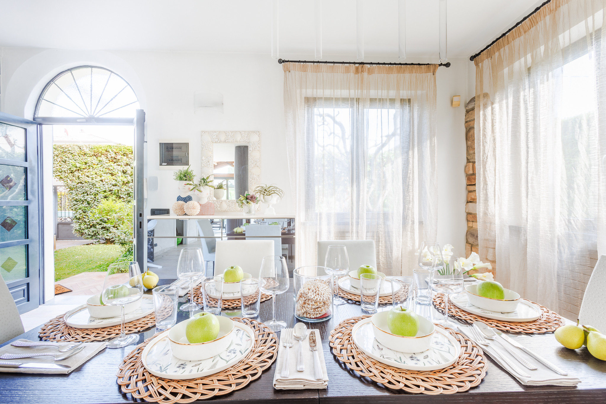 De begane grond van de witgestucte villa opent met een eigentijdse keuken in u-vorm met een groot, marmeren werkblad, voorzien van alle gemakken. Naast het keukengedeelte is de eettafel gepositioneerd met naar het midden van het open plan vertrek de comfortabele zithoek met sat. TV. Hierachter is een badkamer met bad gelegen en een mooie uitbouw die als een soort serre een extra zitruimte met twee luie stoelen verschaft en toegang geeft tot het overdekte terras met de eettafel buiten. Op de eerste verdieping van de villa liggen drie slaapkamers: een eenpersoons en twee tweepersoons slaapkamers die een badkamer delen.