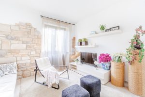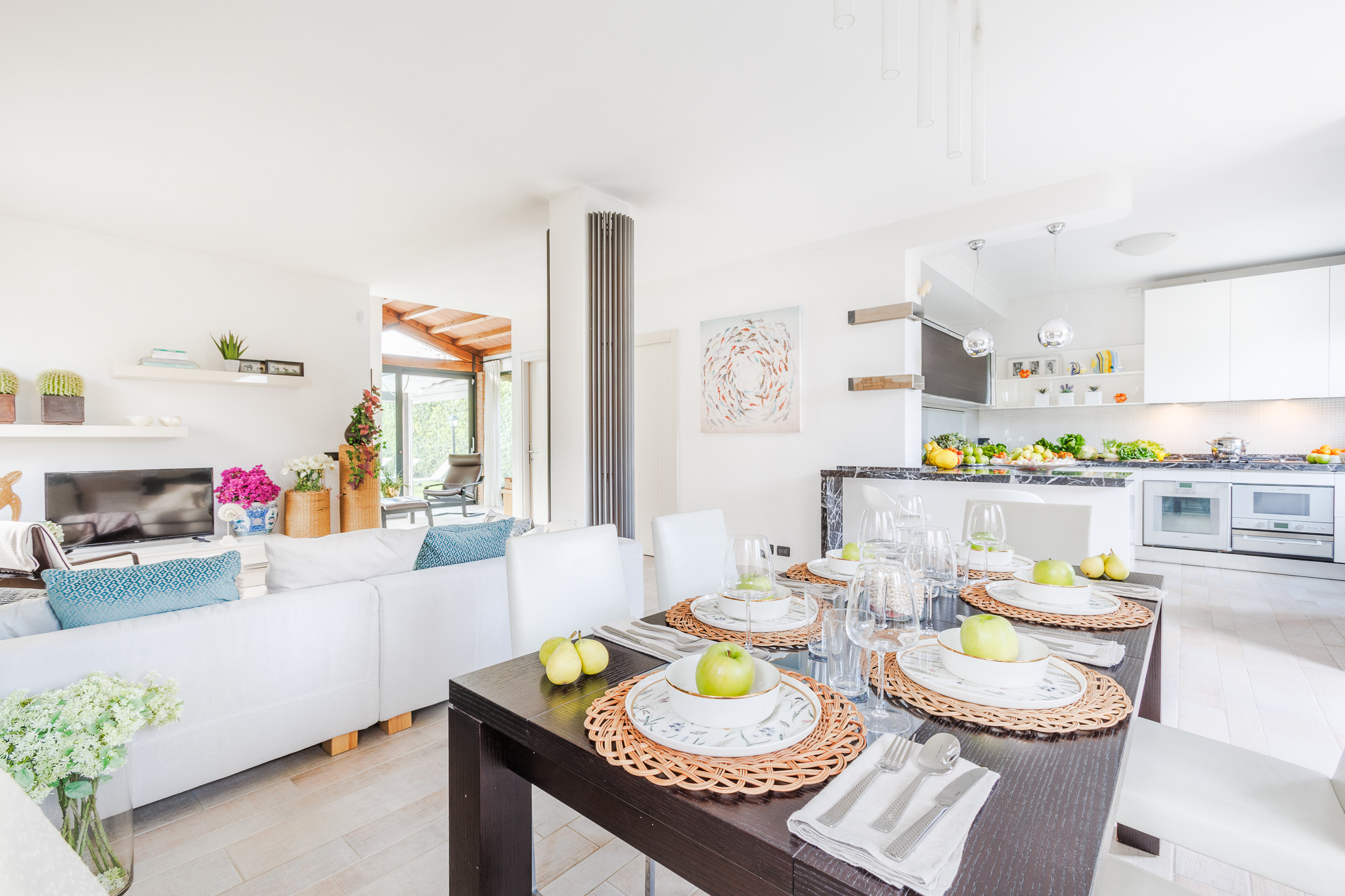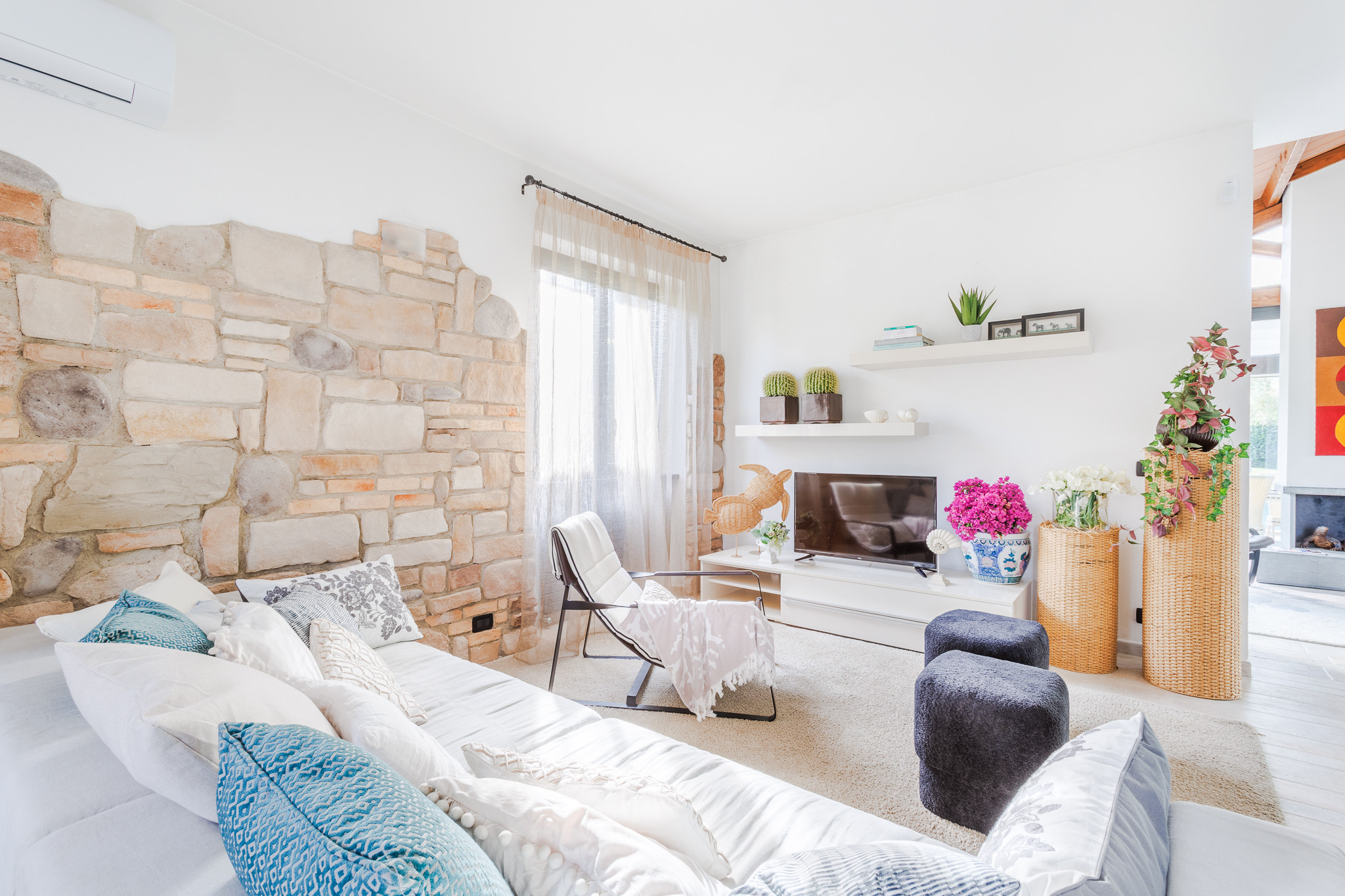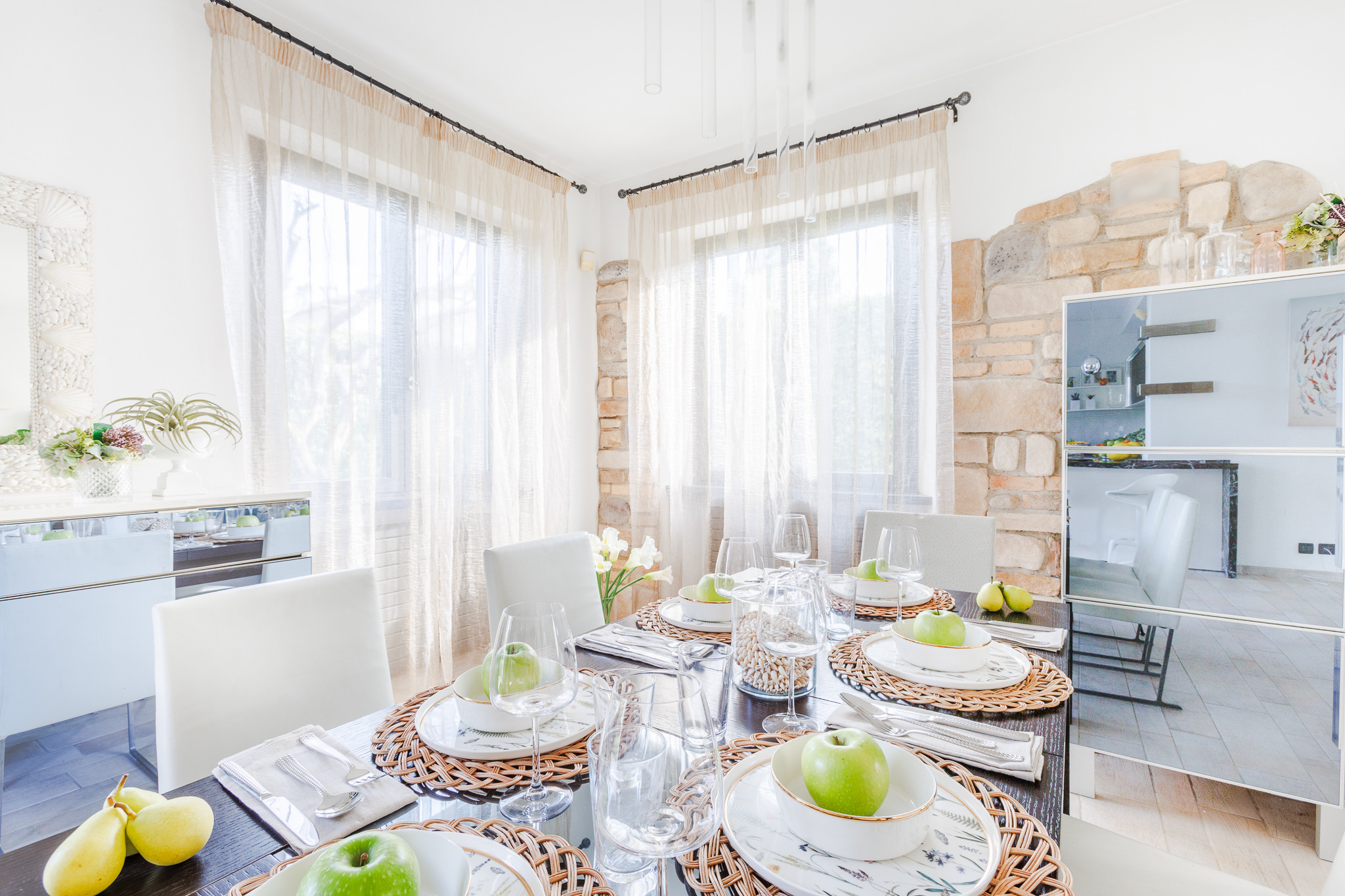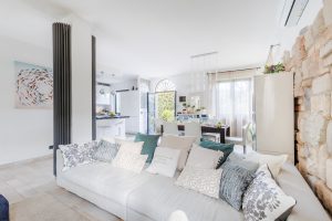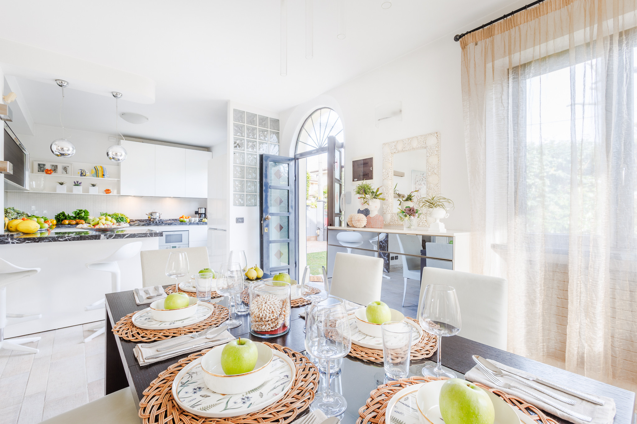 De begane grond van de witgestucte villa opent met een eigentijdse keuken in u-vorm met een groot, marmeren werkblad, voorzien van alle gemakken. Naast het keukengedeelte is de eettafel gepositioneerd met naar het midden van het open plan vertrek de comfortabele zithoek met sat. TV. Hierachter is een badkamer met bad gelegen en een mooie uitbouw die als een soort serre een extra zitruimte met twee luie stoelen verschaft en toegang geeft tot het overdekte terras met de eettafel buiten. Op de eerste verdieping van de villa liggen drie slaapkamers: een eenpersoons en twee tweepersoons slaapkamers die een badkamer delen.