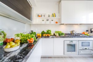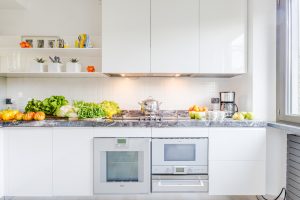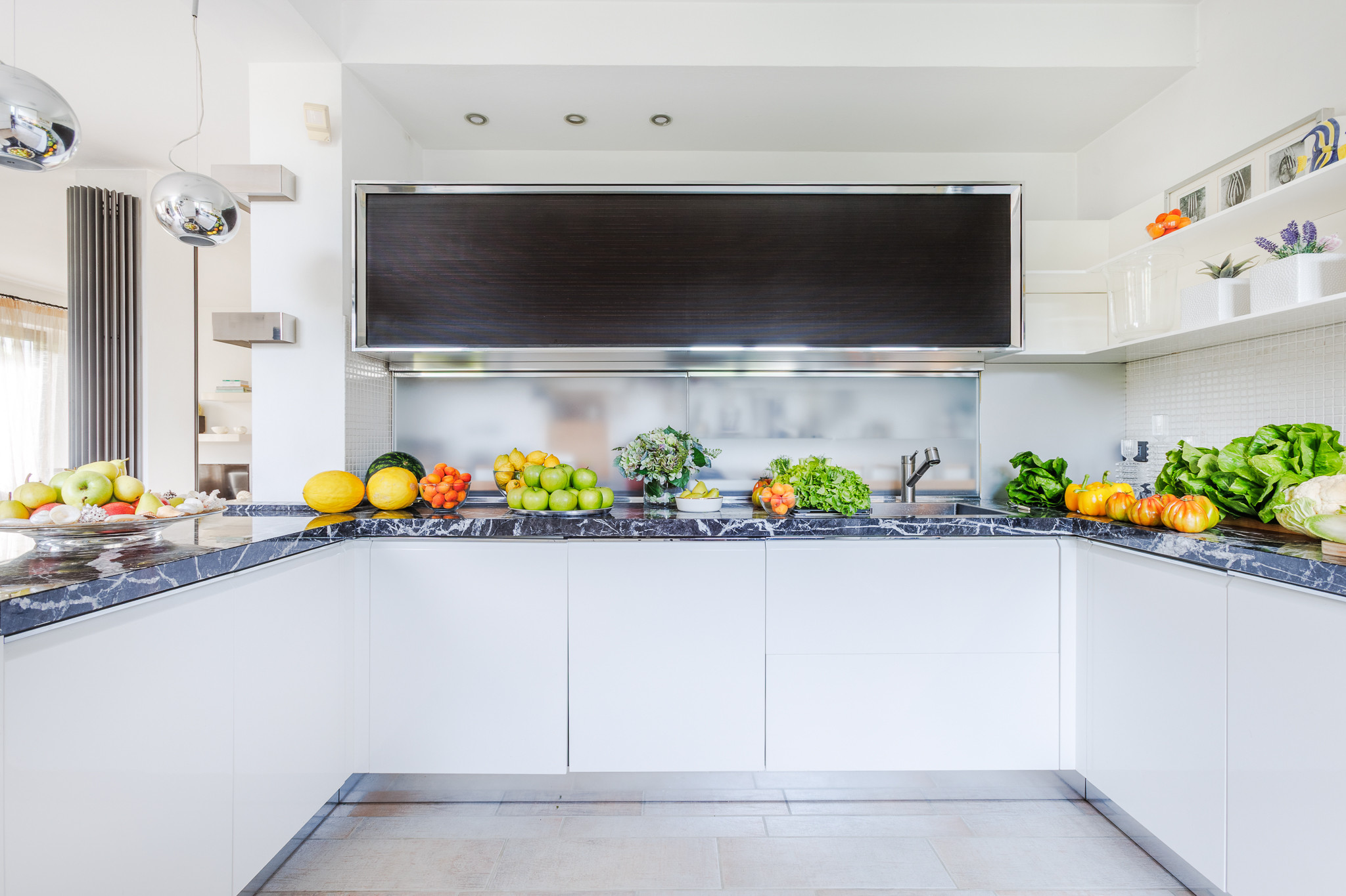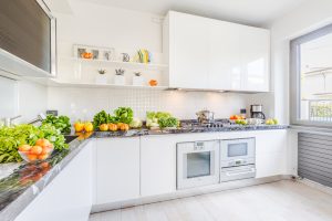 u-vormige keuken, koelkast, oven, magnetron, koffiezet apparaat, waterkoker, wasmachine en -droger.