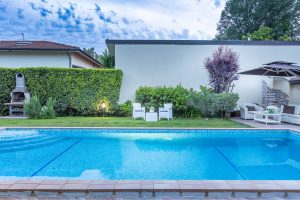 privé zwembad, 5 x 13 m, 1-2 m diep. Zonneterras met ligbedden en dagbed.