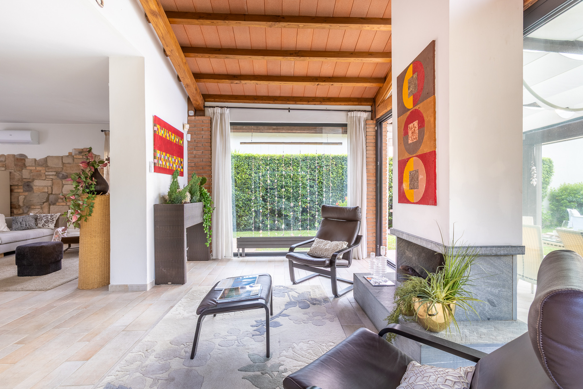 open plan living met eetgedeelte, zitgedeelte met sat TV en wifi, serre met open haard (sier) en 2 fauteuils en toegang tot overdekt terras