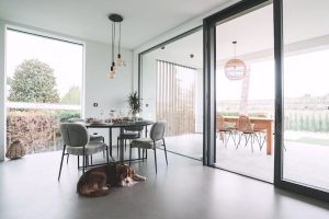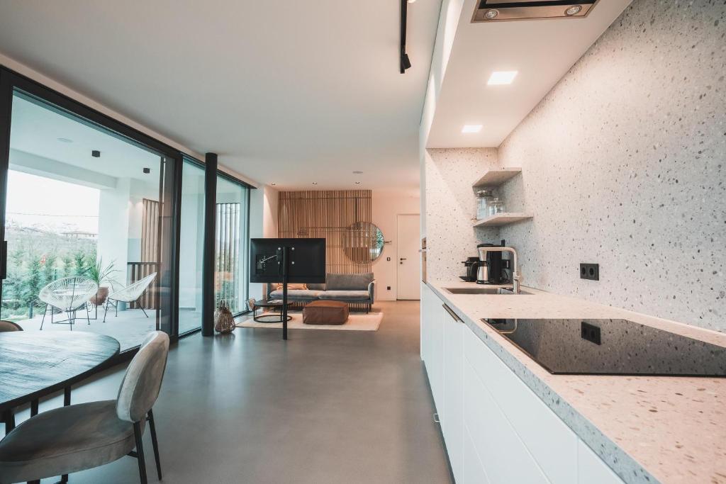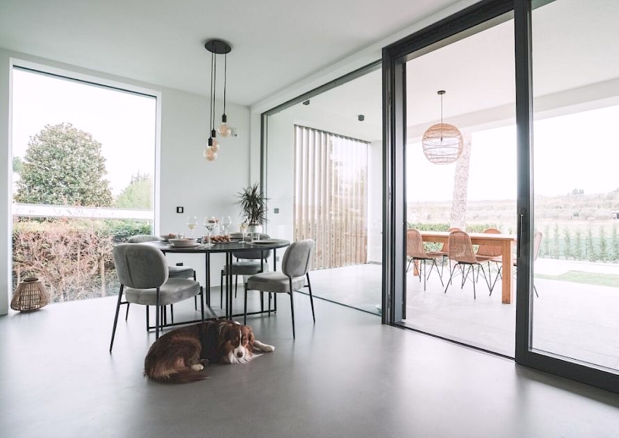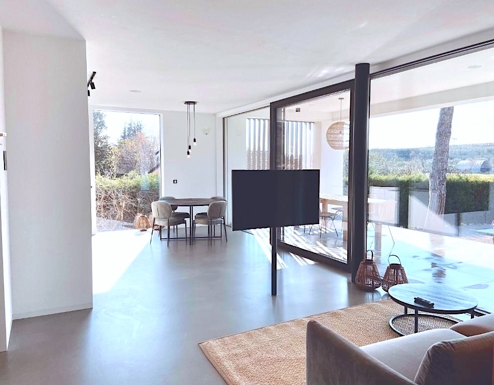 open plan living met ronde eettafel en zithoek, wifi en Sat TV met Netflix, schuifpui naar het overdekte terras
