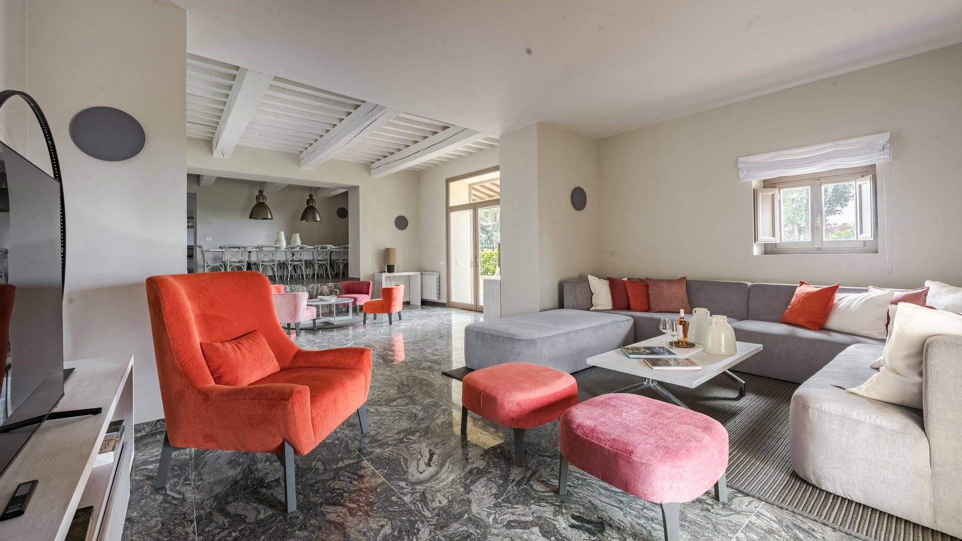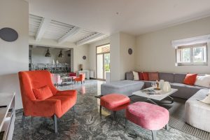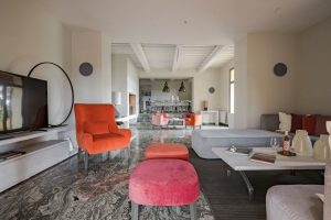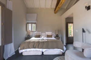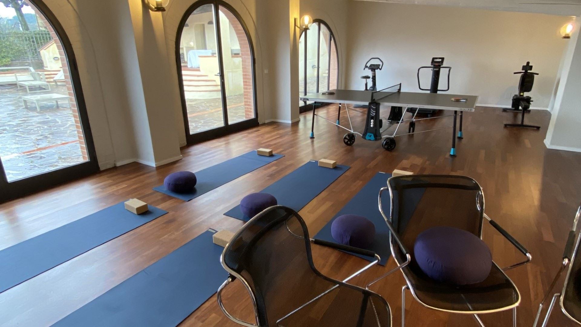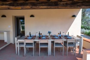 Met een binnenplaats voor de villa, een groot overdekt terras met eettafel, een loungehoek in de hoek en een fraai bijgebouw met boogramen waar een fitness is gemaakt, is er volop ruimte rond de villa waar je met een groot gezelschap kan verblijven en kan relaxen of juist aan je conditie werken. Een brede trappartij leidt vanaf deze binnenplaats naar beneden naar een lager niveau van de tuin waar het zwembad is gelegen. Hier is ook de studio annex te vinden. Een aparte ruimte met een terrasje voor de deur, een kleine keukenhoek, een tweepersoons slaapkamer en een eigen badkamer. Niet alleen ideaal als zesde slaapkamer, maar ook handig als badkamer en extra keukenhoek voor de zonneliefhebbers die op een van de bedjes aan het zwembad liggen.