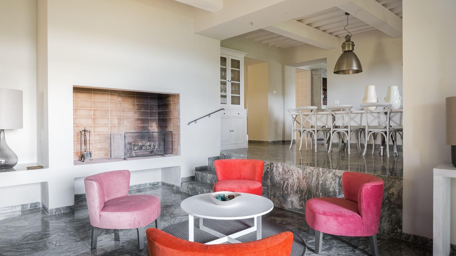op meerdere niveau’s, zithoek bij open haard, eettafel op hoger deel. Kleine zitkamer op eerste verdieping met TV