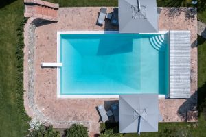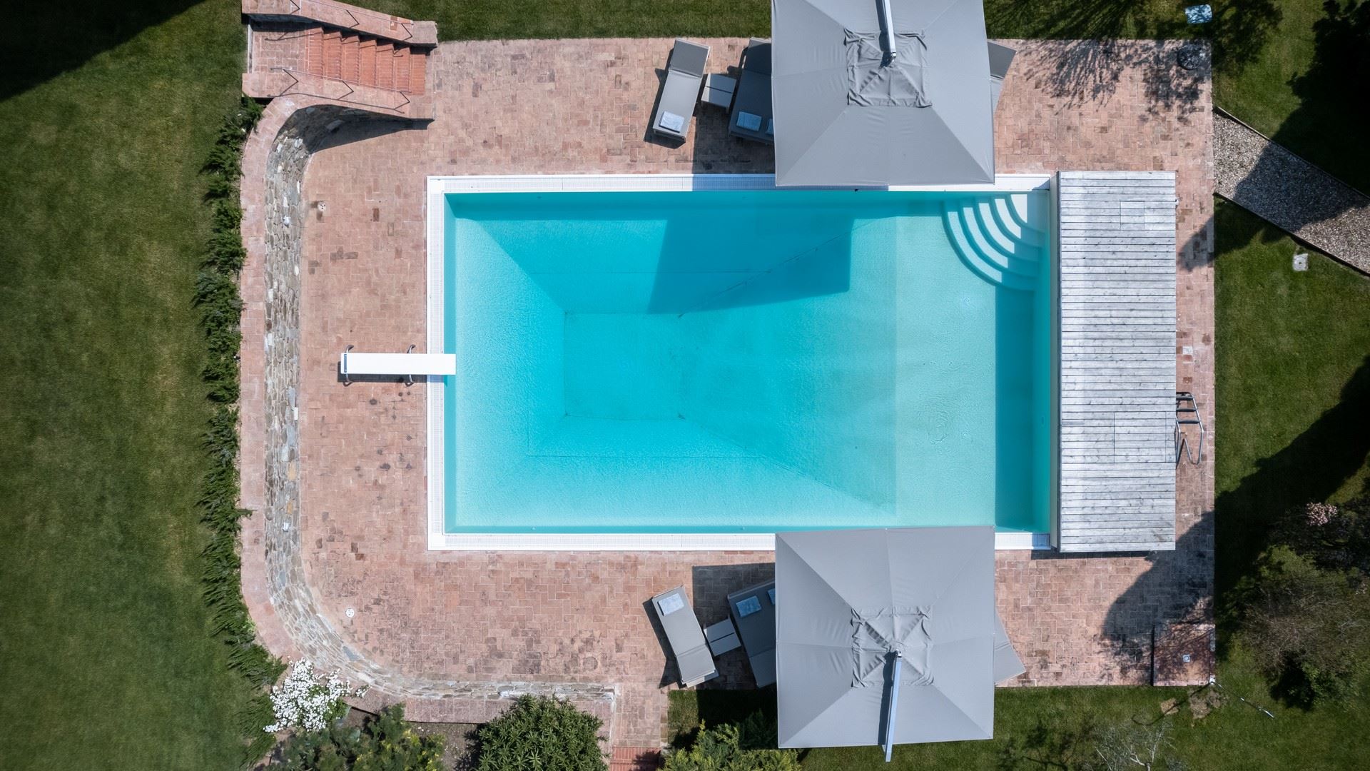 privé zwembad, 14 x 7 m, 1.2 – 2.5 m diep. Zuivering dmv chloor, open van mei tot september. Zonneterras met ligbedden en parasols.