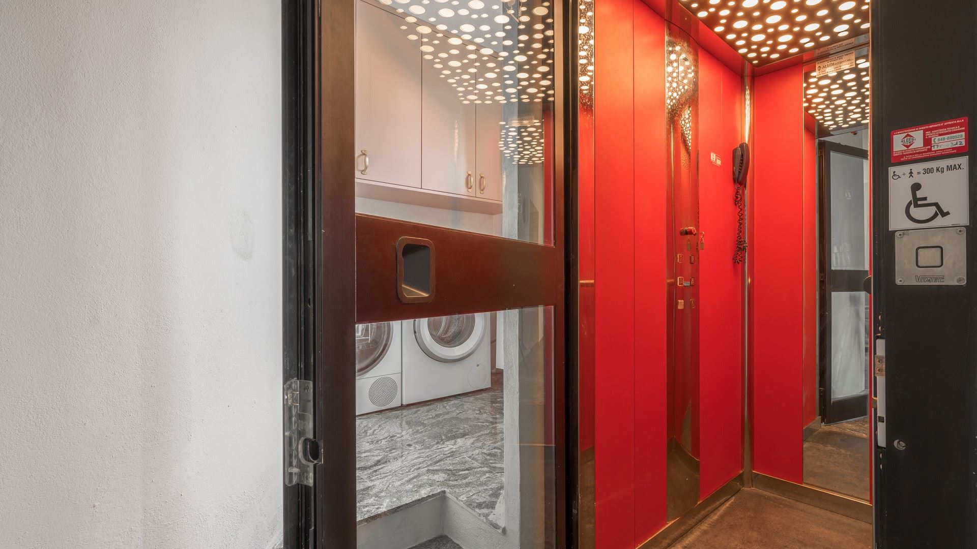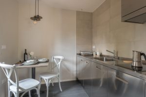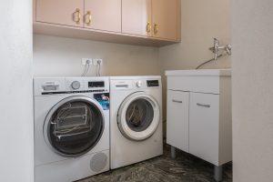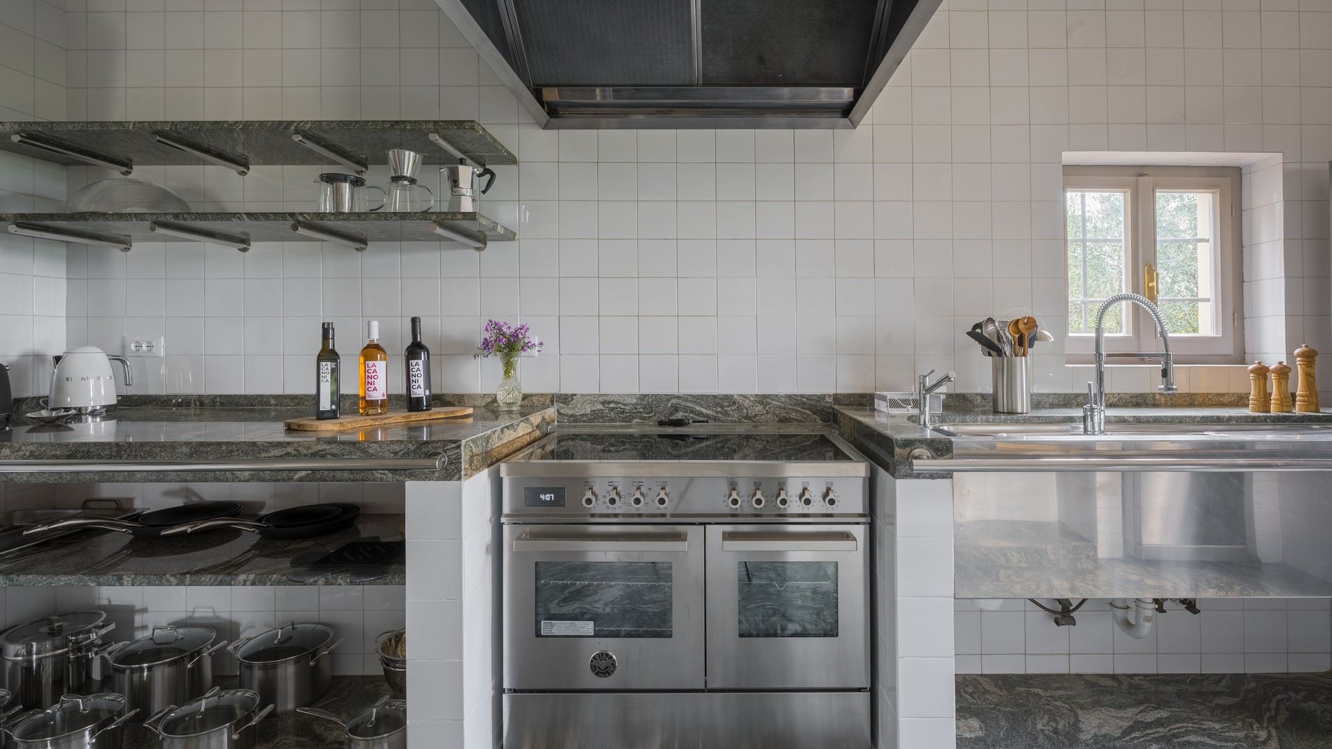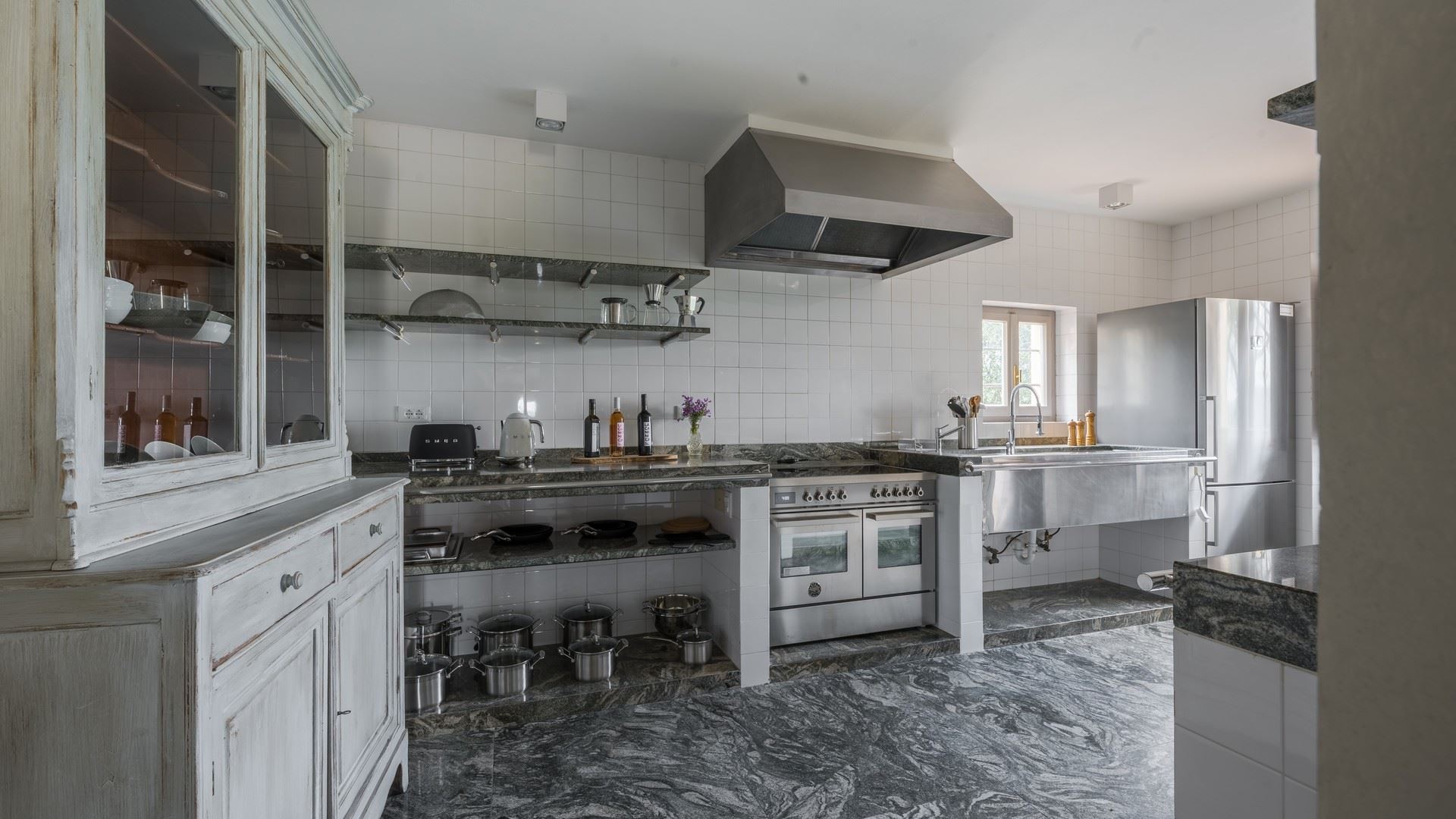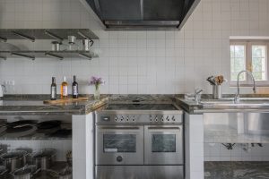 industrieel ingerichte keuken, met koelkast met vriesvak, oven, magnetron, vaatwasser. Bijkeuken met wasmachine en droger.