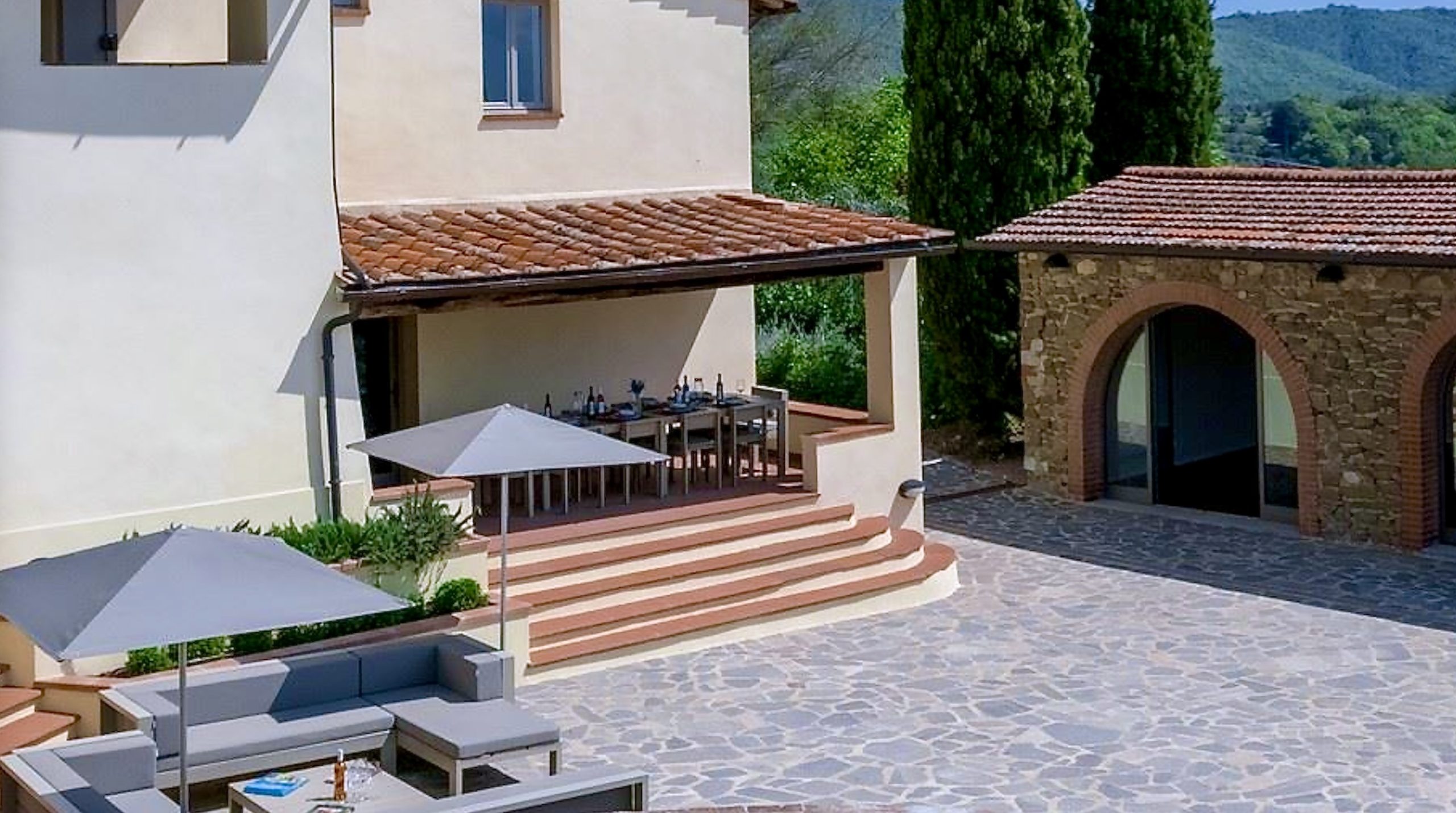 overdekt terras met eettafel bij de villa, loungeterras op binnenplaats, fitness ruimte aan de binnenplaats gelegen, lager tuindeel met zwembad en annex.
