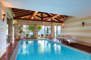 De begane grond van de villa bevat ook een overdekt zwembad, perfect voor het hele jaar door waterpret, met grote schuiframen die in de zomer kunnen worden geopend en naar de tuin leiden.