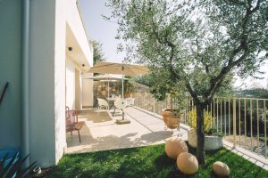 geheel omheinde tuin, met parkeerplaats voor twee auto’s op eigen terrein. Groot, deels overdekt terras voor de villa. Zwembad op een lager niveau in de tuin.