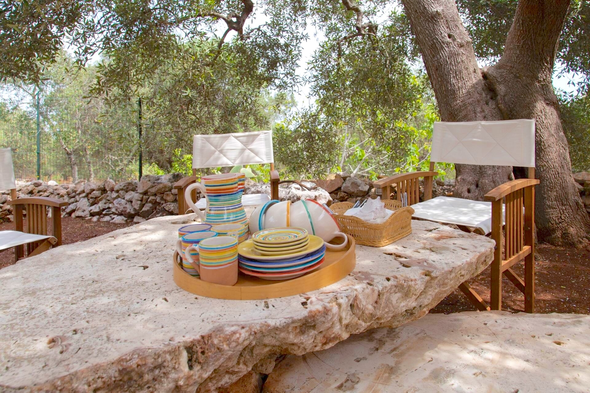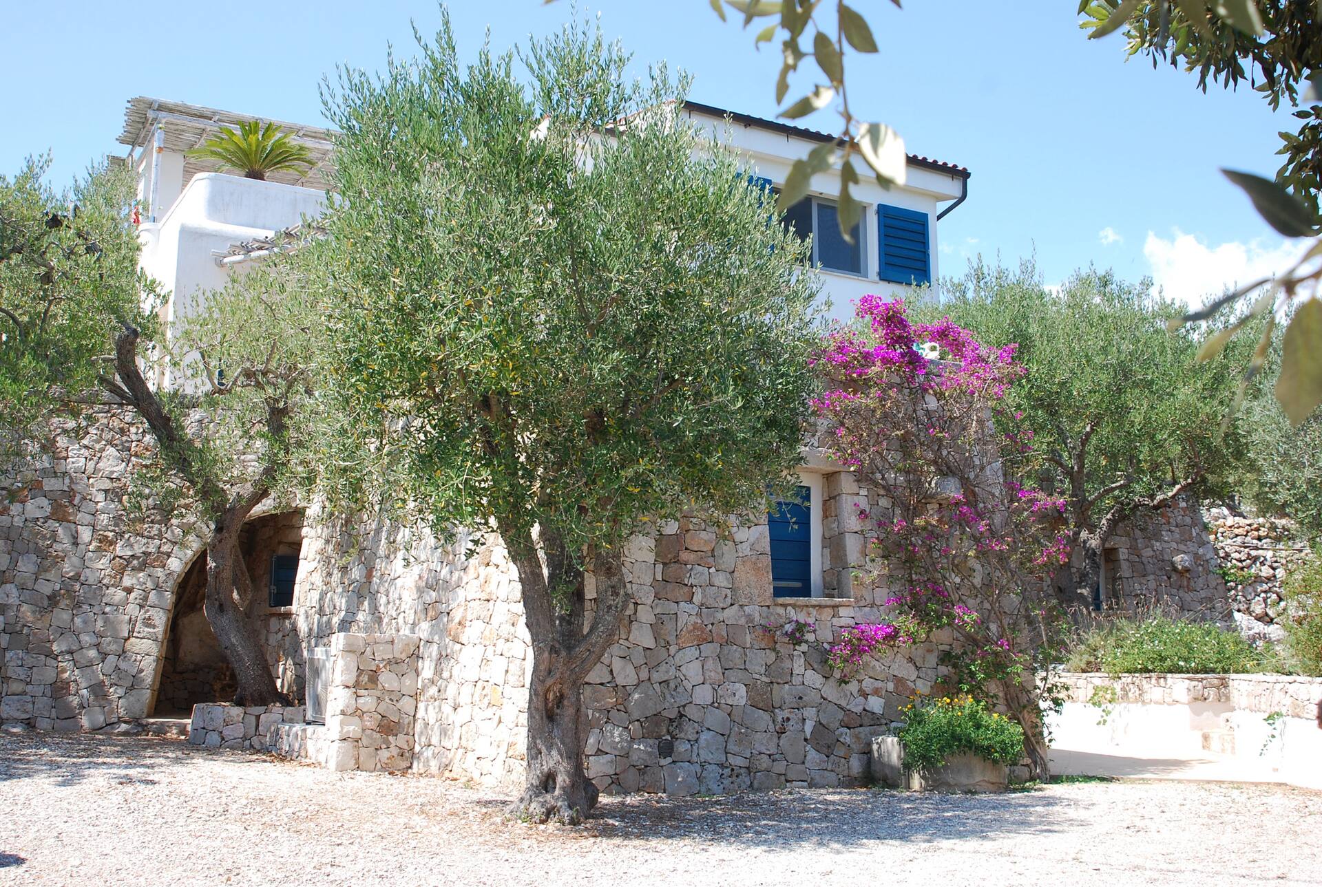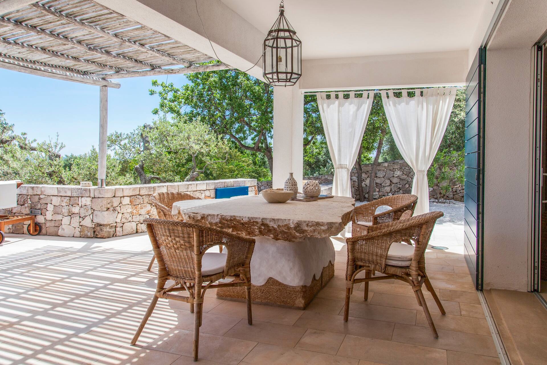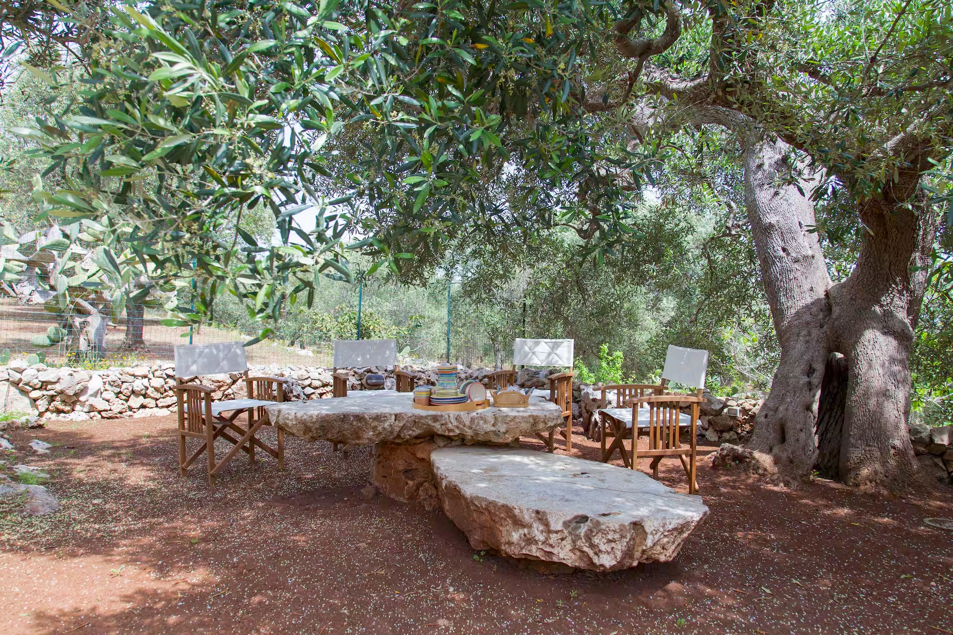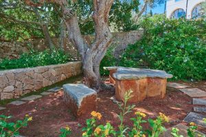 uitgestrekte tuin in niveau’s met allerlei zithoekjes, stenen tafel onder de olijfbomen, hangmat, BBQ met pizzaoven.