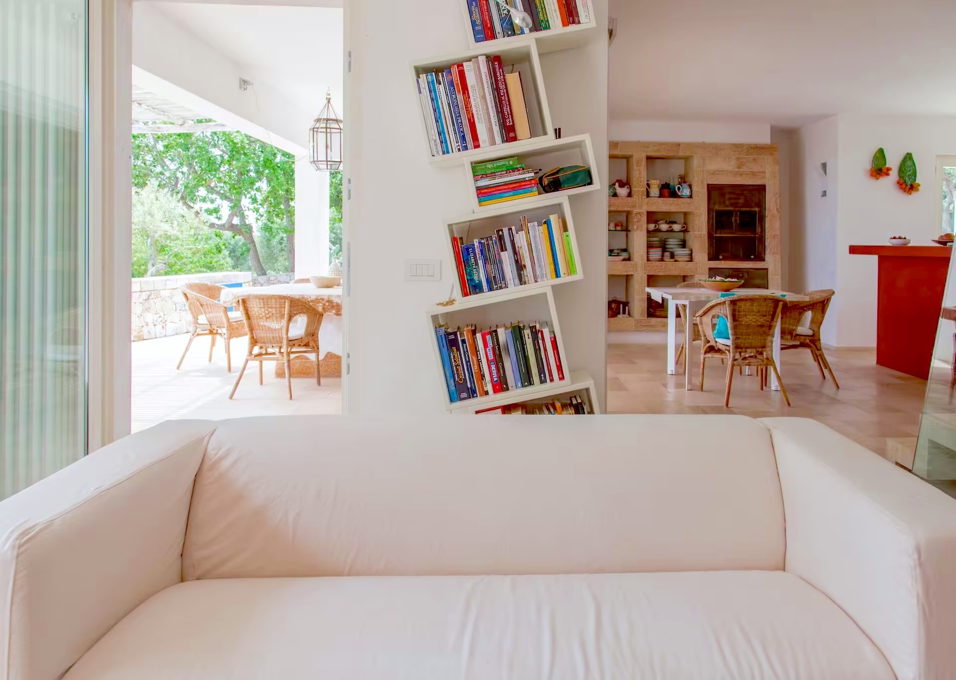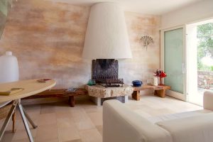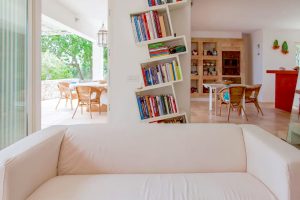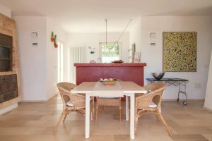 open plan living met zithoek en open haard, eetgedeelte, beide ruimtes met openslaande deuren naar het overdekte terras