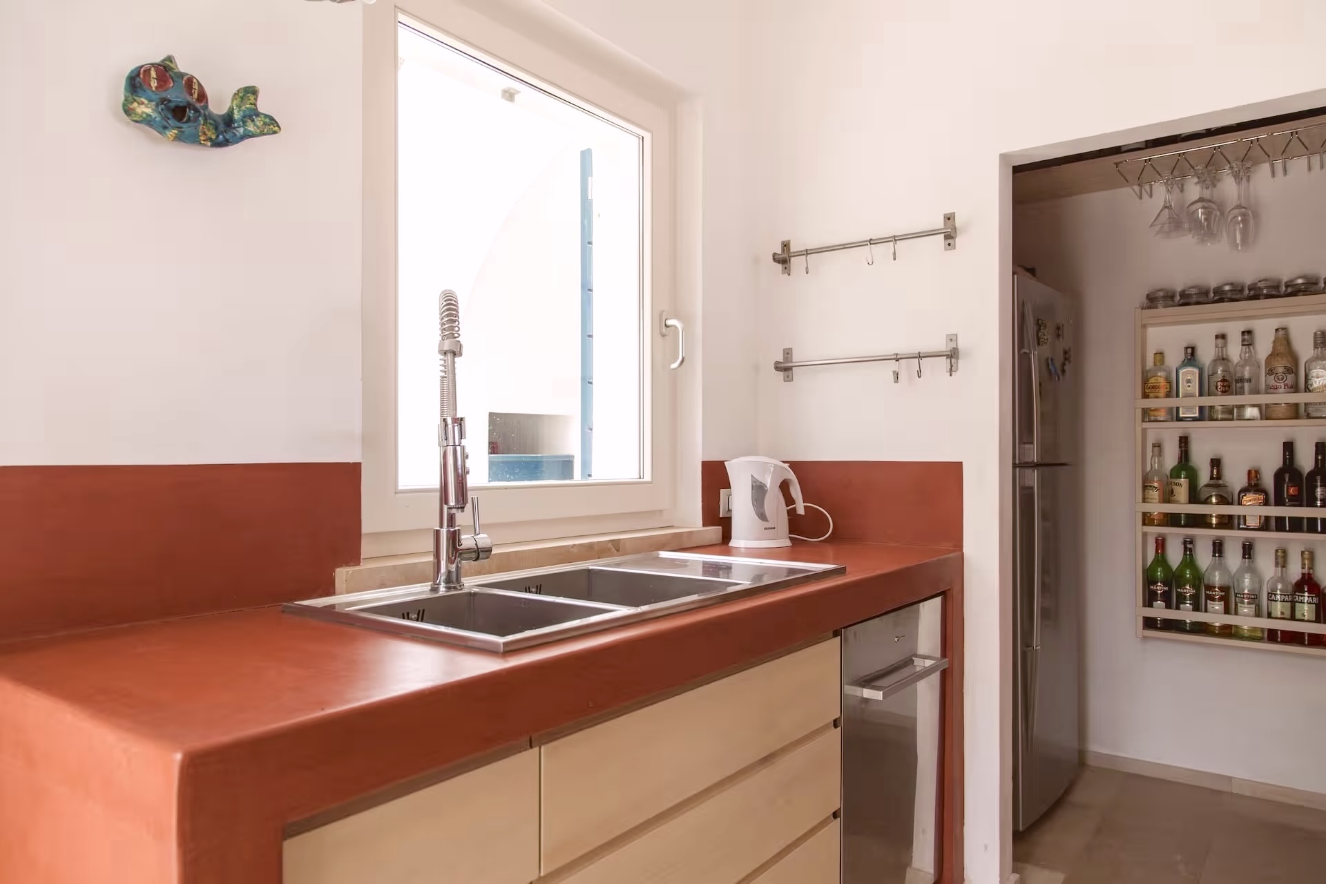 open keuken gescheiden van de living door kookeiland, koelkast met vriezer, oven, vaatwasser. Bijkeuken op BG met wasmachine