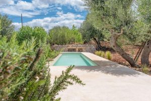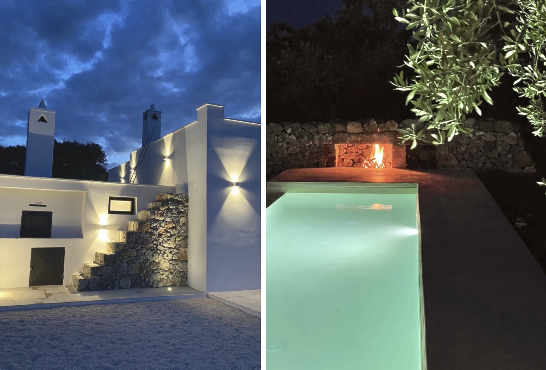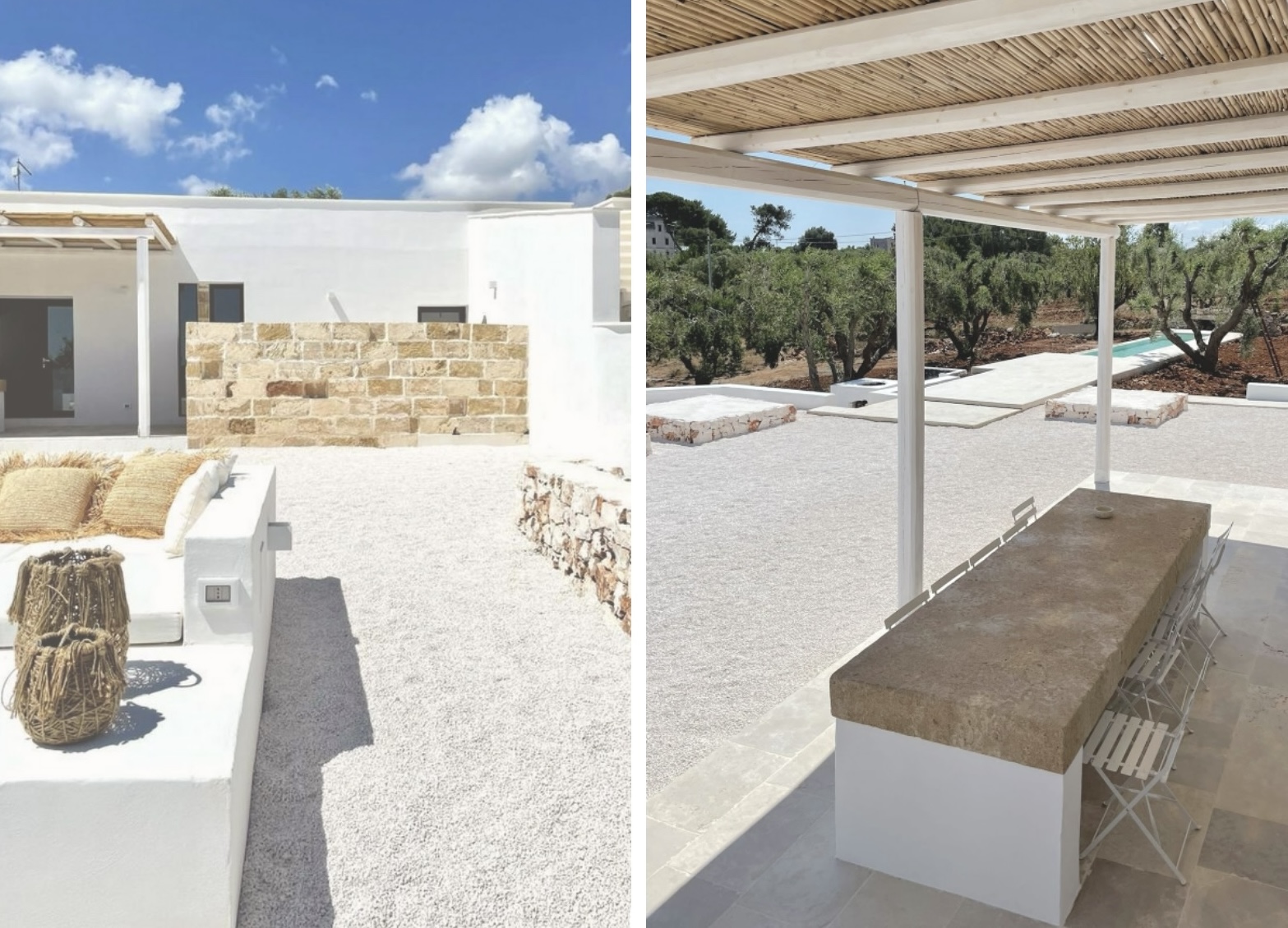 De tuin van de villa is een mooie, strak vormgegeven buitenruimte. Met direct aan de villa een groot overdekte terras met de grote eettafel met een blad van lokaal marmer. Links hiervan is een ingebouwde pizzaoven te vinden, een monumentaal element met de oude natuurstenen trap naar het dak. Een paar treden lager dan het overdekte terras is een groot relaxterras, een zitkuil eigenlijk, gemaakt met strak belijnde muurbanken. Rechts hiervan ligt de buitenkeuken, een spel van kubussen waarin een grill is opgenomen met een grote plantenbak met rozemarijn. Hier liggen een drietal rechthoekige verhoogde kubussen die als ligbed annex zonnebed dienen.
