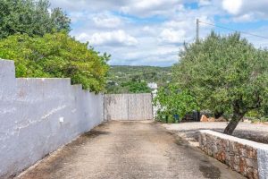 toegang via hek van 2,8 m breed, parkeerplaats voor 2 auto’s op eigen terrein. Grote olijfboomgaard rond de villa.
