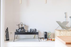 met ontbijttafel, koelkast met vriesvak, oven-magnetron, vaatwasser. Bijkeuken met wasmachine en strijkfaciliteiten.